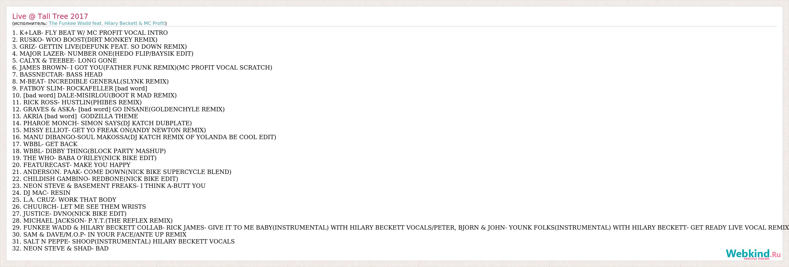 1. K+LAB- FLY BEAT W/ MC PROFIT VOCAL INTRO 2. RUSKO- WOO BOOST(DIRT MONKEY REMIX) 3. GRIZ- GETTIN LIVE(DEFUNK FEAT. SO DOWN REMIX) 4. MAJOR LAZER- NUMBER ONE(HEDO FLIP/BAYSIK EDIT) 5. CALYX & TEEBEE- LONG GONE 6. JAMES BROWN- I GOT YOU(FATHER FUNK REMIX)(MC PROFIT VOCAL SCRATCH) 7. BASSNECTAR- BASS HEAD 8. M-BEAT- INCREDIBLE GENERAL(SLYNK REMIX) 9. FATBOY SLIM- ROCKAFELLER [bad word] 10. [bad word] DALE-MISIRLOU(BOOT R MAD REMIX) 11. RICK ROSS- HUSTLIN(PHIBES REMIX) 12. GRAVES & ASKA- [bad word] GO INSANE(GOLDENCHYLE REMIX) 13. AKRIA [bad word] GODZILLA THEME 14. PHAROE MONCH- SIMON SAYS(DJ KATCH DUBPLATE) 15. MISSY ELLIOT- GET YO FREAK ON(ANDY NEWTON REMIX) 16. MANU DIBANGO-SOUL MAKOSSA(DJ KATCH REMIX OF YOLANDA BE COOL EDIT) 17. WBBL- GET BACK 18. WBBL- DIBBY THING(BLOCK PARTY MASHUP) 19. THE WHO- BABA O’RILEY(NICK BIKE EDIT) 20. FEATURECAST- MAKE YOU HAPPY 21. ANDERSON. PAAK- COME DOWN(NICK BIKE SUPERCYCLE BLEND) 22. CHILDISH GAMBINO- REDBONE(NICK BIKE EDIT) 23. NEON STEVE & BASEMENT FREAKS- I THINK A-BUTT YOU 24. DJ MAC- RESIN 25. L.A. CRUZ- WORK THAT BODY 26. CHUURCH- LET ME SEE THEM WRISTS 27. JUSTICE- DVNO(NICK BIKE EDIT) 28. MICHAEL JACKSON- P.Y.T.(THE REFLEX REMIX) 29. FUNKEE WADD & HILARY BECKETT COLLAB- RICK JAMES- GIVE IT TO ME BABY(INSTRUMENTAL) WITH HILARY BECKETT VOCALS/PETER, BJORN & JOHN- YOUNK FOLKS(INSTRUMENTAL) WITH HILARY BECKETT- GET READY LIVE VOCAL REMIX 30. SAM & DAVE/M.O.P- IN YOUR FACE/ANTE UP REMIX 31. SALT N PEPPE- SHOOP(INSTRUMENTAL) HILARY BECKETT VOCALS 32. NEON STEVE & SHAD- BAD