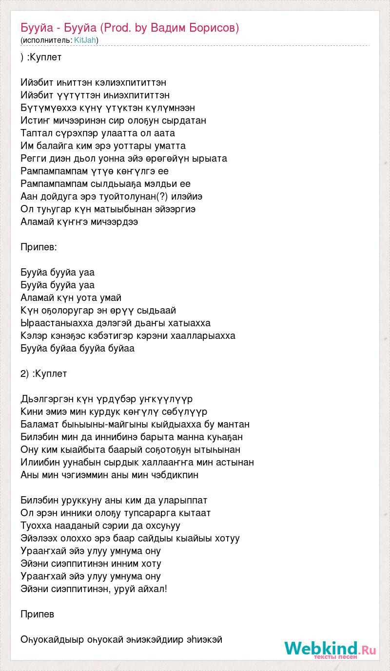 ) :Куплет Ийэбит иһиттэн кэлиэхпититтэн Ийэбит үүтүттэн иһиэхпититтэн Бүтүмүөххэ күнү үтүктэн күлүмнээн Истиҥ мичээринэн сир олоҕун сырдатан Таптал сүрэхпэр улаатта ол аата Им балайга ким эрэ уоттары уматта Регги диэн дьол уонна эйэ өрөгөйүн ырыата Рампампампам үтүө көҥүлгэ ее Рампампампам сылдьыаҕа мэлдьи ее Аан дойдуга эрэ туойтолунан(?) илэйиэ Ол туһугар күн матыыбынан эйээргиэ Аламай күҥҥэ мичээрдээ Припев: Бууйа бууйа уаа Бууйа бууйа уаа Аламай күн уота умай Күн оҕолоругар эн өрүү сыдьаай Ыраастаныахха дэлэгэй дьаҥы хатыахха Кэлэр кэнэҕэс кэбэтигэр кэрэни хаалларыахха Бууйа буйаа бууйа буйаа 2) :Куплет Дьэлгэргэн күн үрдүбэр уҥкүүлүүр Кини эмиэ мин курдук көҥүлү сөбүлүүр Баламат быһыыны-майгыны кыйдыахха бу мантан Билэбин мин да иннибинэ барыта манна куһаҕан Ону ким кыайбыта баарый соҕотоҕун ытыһынан Илиибин уунабын сырдык халлааҥҥа мин астынан Аны мин чэгиэммин аны мин чэбдикпин Билэбин уруккуну аны ким да уларыппат Ол эрэн инники олоҕу тупсарарга кытаат Туохха нааданый сэрии да охсуһуу Эйэлээх олоххо эрэ баар сайдыы кыайыы хотуу Урааҥхай эйэ улуу умнума ону Эйэни сиэппитинэн инним хоту Урааҥхай эйэ улуу умнума ону Эйэни сиэппитинэн, уруй айхал! Припев Оһуокайдыыр оһуокай эһиэкэйдиир эhиэкэй