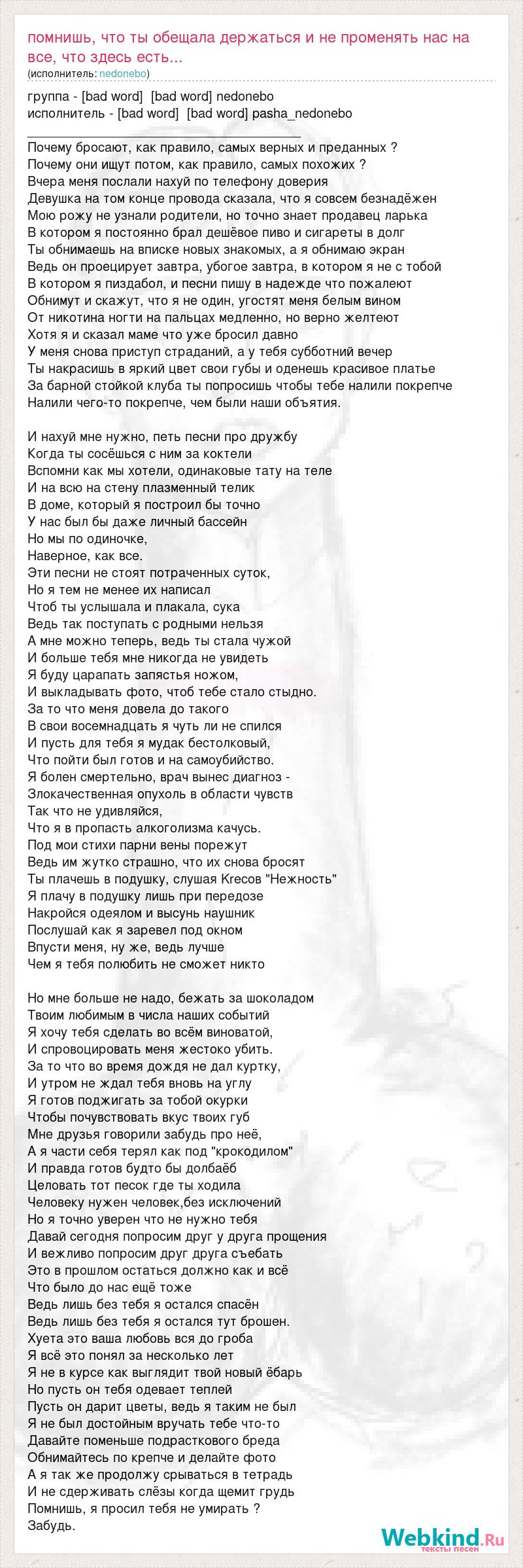 группа - [bad word] [bad word] nedonebo исполнитель - [bad word] [bad word] pasha_nedonebo ______________________________________ Почему бросают, как правило, самых верных и преданных ? Почему они ищут потом, как правило, самых похожих ? Вчера меня послали нахуй по телефону доверия Девушка на том конце провода сказала, что я совсем безнадёжен Мою рожу не узнали родители, но точно знает продавец ларька В котором я постоянно брал дешёвое пиво и сигареты в долг Ты обнимаешь на вписке новых знакомых, а я обнимаю экран Ведь он проецирует завтра, убогое завтра, в котором я не с тобой В котором я пиздабол, и песни пишу в надежде что пожалеют Обнимут и скажут, что я не один, угостят меня белым вином От никотина ногти на пальцах медленно, но верно желтеют Хотя я и сказал маме что уже бросил давно У меня снова приступ страданий, а у тебя субботний вечер Ты накрасишь в яркий цвет свои губы и оденешь красивое платье За барной стойкой клуба ты попросишь чтобы тебе налили покрепче Налили чего-то покрепче, чем были наши объятия. И нахуй мне нужно, петь песни про дружбу Когда ты сосёшься с ним за коктели Вспомни как мы хотели, одинаковые тату на теле И на всю на стену плазменный телик В доме, который я построил бы точно У нас был бы даже личный бассейн Но мы по одиночке, Наверное, как все. Эти песни не стоят потраченных суток, Но я тем не менее их написал Чтоб ты услышала и плакала, сука Ведь так поступать с родными нельзя А мне можно теперь, ведь ты стала чужой И больше тебя мне никогда не увидеть Я буду царапать запястья ножом, И выкладывать фото, чтоб тебе стало стыдно. За то что меня довела до такого В свои восемнадцать я чуть ли не спился И пусть для тебя я мудак бестолковый, Что пойти был готов и на самоубийство. Я болен смертельно, врач вынес диагноз - Злокачественная опухоль в области чувств Так что не удивляйся, Что я в пропасть алкоголизма качусь. Под мои стихи парни вены порежут Ведь им жутко страшно, что их снова бросят Ты плачешь в подушку, слушая Krecoв "Нежность" Я плачу в подушку лишь при передозе Накройся одеялом и высунь наушник Послушай как я заревел под окном Впусти меня, ну же, ведь лучше Чем я тебя полюбить не сможет никто Но мне больше не надо, бежать за шоколадом Твоим любимым в числа наших событий Я хочу тебя сделать во всём виноватой, И спровоцировать меня жестоко убить. За то что во время дождя не дал куртку, И утром не ждал тебя вновь на углу Я готов поджигать за тобой окурки Чтобы почувствовать вкус твоих губ Мне друзья говорили забудь про неё, А я части себя терял как под "крокодилом" И правда готов будто бы долбаёб Целовать тот песок где ты ходила Человеку нужен человек,без исключений Но я точно уверен что не нужно тебя Давай сегодня попросим друг у друга прощения И вежливо попросим друг друга съебать Это в прошлом остаться должно как и всё Что было до нас ещё тоже Ведь лишь без тебя я остался спасён Ведь лишь без тебя я остался тут брошен. Хуета это ваша любовь вся до гроба Я всё это понял за несколько лет Я не в курсе как выглядит твой новый ёбарь Но пусть он тебя одевает теплей Пусть он дарит цветы, ведь я таким не был Я не был достойным вручать тебе что-то Давайте поменьше подрасткового бреда Обнимайтесь по крепче и делайте фото А я так же продолжу срываться в тетрадь И не сдерживать слёзы когда щемит грудь Помнишь, я просил тебя не умирать ? Забудь.