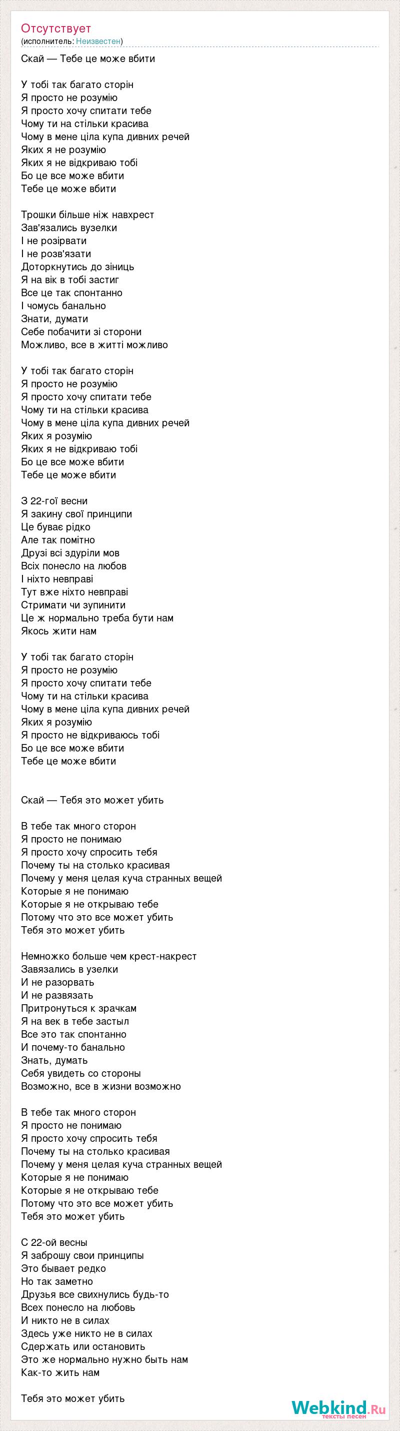 Скай — Тебе це може вбити У тобі так багато сторін Я просто не розумію Я просто хочу спитати тебе Чому ти на стільки красива Чому в мене ціла купа дивних речей Яких я не розумію Яких я не відкриваю тобі Бо це все може вбити Тебе це може вбити Трошки більше ніж навхрест Зав'язались вузелки І не розірвати І не розв'язати Доторкнутись до зіниць Я на вік в тобі застиг Все це так спонтанно І чомусь банально Знати, думати Себе побачити зі сторони Можливо, все в житті можливо У тобі так багато сторін Я просто не розумію Я просто хочу спитати тебе Чому ти на стільки красива Чому в мене ціла купа дивних речей Яких я розумію Яких я не відкриваю тобі Бо це все може вбити Тебе це може вбити З 22-гої весни Я закину свої принципи Це буває рідко Але так помітно Друзі всі здуріли мов Всіх понесло на любов І ніхто невправі Тут вже ніхто невправі Стримати чи зупинити Це ж нормально треба бути нам Якось жити нам У тобі так багато сторін Я просто не розумію Я просто хочу спитати тебе Чому ти на стільки красива Чому в мене ціла купа дивних речей Яких я розумію Я просто не відкриваюсь тобі Бо це все може вбити Тебе це може вбити Скай — Тебя это может убить В тебе так много сторон Я просто не понимаю Я просто хочу спросить тебя Почему ты на столько красивая Почему у меня целая куча странных вещей Которые я не понимаю Которые я не открываю тебе Потому что это все может убить Тебя это может убить Немножко больше чем крест-накрест Завязались в узелки И не разорвать И не развязать Притронуться к зрачкам Я на век в тебе застыл Все это так спонтанно И почему-то банально Знать, думать Себя увидеть со стороны Возможно, все в жизни возможно В тебе так много сторон Я просто не понимаю Я просто хочу спросить тебя Почему ты на столько красивая Почему у меня целая куча странных вещей Которые я не понимаю Которые я не открываю тебе Потому что это все может убить Тебя это может убить С 22-ой весны Я заброшу свои принципы Это бывает редко Но так заметно Друзья все свихнулись будь-то Всех понесло на любовь И никто не в силах Здесь уже никто не в силах Сдержать или остановить Это же нормально нужно быть нам Как-то жить нам Тебя это может убить