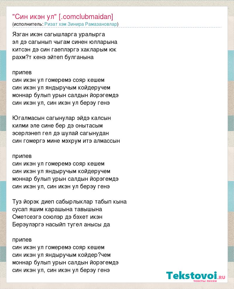 Язган икэн сагышларга уралырга эл дэ сагынып чыгам синен юлларына китсэн дэ син гаеплэргэ хакларым юк рахм?т кенэ эйтеп булганына припев син икэн ул гомеремэ сояр кешем син икэн ул яндыручым койдеручем моннар булып урын салдын йорэгемдэ син икэн ул, син икэн ул берэу генэ Югалмасын сагынулар эйдэ калсын килми эле сине бер дэ онытасым эсерлэнеп гел дэ шулай сагынудан син гомергэ мине мэхрум итэ алмассын припев син икэн ул гомеремэ сояр кешем син икэн ул яндыручым койдеручем моннар булып урын салдын йорэгемдэ син икэн ул, син икэн ул берэу генэ Туз йорэк диеп сабырлыклар табып кына сусап яшим карашына тавышына Ометсезгэ союлэр дэ бэхет икэн Берэулэргэ насыйп тугел анысы да припев син икэн ул гомеремэ сояр кешем син икэн ул яндыручым койдер?чем моннар булып урын салдын йорэгемдэ син икэн ул, син икэн ул берэу генэ
