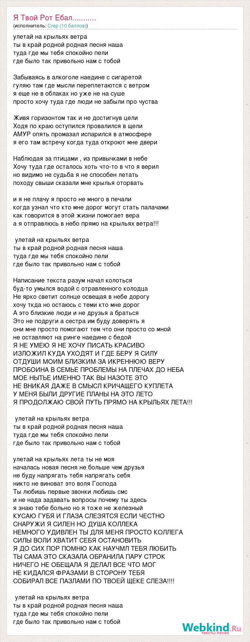 улетай на крыльях ветра ты в край родной родная песня наша туда где мы тебя спокойно пели где было так привольно нам с тобой Забываясь в алкоголе наедине с сигаретой гуляю там где мысли переплетаются с ветром я еще не в облаках но уже не на суше просто хочу туда где люди не забыли про чуства Живя горизонтом так и не достигнув цели Ходя по краю оступился провалился в щели АМУР опять промазал испарился в атмосфере я его там встречу когда туда откроют мне двери Наблюдая за птицами , из привычками в небе Хочу туда где осталось хоть что-то в что я верил но видимо не судьба я не способен летать походу свыши сказали мне крылья оторвать и я не плачу я просто не много в печали когда узнал что кто мне дорог могут стать палачами как говорится в этой жизни помогает вера а я отправлюсь в небо прямо на крыльях ветра!!! улетай на крыльях ветра ты в край родной родная песня наша туда где мы тебя спокойно пели где было так привольно нам с тобой Написание текста разум начал колоться буд-то умылся водой с отравленного колодца Не ярко светит солнце освещая в небе дорогу хочу ткда но остаюсь с теми кто мне дорог А это близкие люди и не друзья а браться Это не подруги а сестра им буду доверять я они мне просто помогают тем что они просто со мной не оставляют на ринге наедине с бедой Я НЕ УМЕЮ Я НЕ ХОЧУ ПИСАТЬ КРАСИВО ИЗЛОЖИЛ КУДА УХОДЯТ И ГДЕ БЕРУ Я СИЛУ ОТДУШИ МОИМ БЛИЗКИМ ЗА ИКРЕННЮЮ ВЕРУ ПРОБОИНА В СЕМЬЕ ПРОБЛЕМЫ НА ПЛЕЧАХ ДО НЕБА МОЕ НЫТЬЕ ИМЕННО ТАК ВЫ НАЗОТЕ ЭТО НЕ ВНИКАЯ ДАЖЕ В СМЫСЛ КРИЧАЩЕГО КУПЛЕТА У МЕНЯ БЫЛИ ДРУГИЕ ПЛАНЫ НА ЭТО ЛЕТО Я ПРОДОЛЖАЮ СВОЙ ПУТЬ ПРЯМО НА КРЫЛЬЯХ ЛЕТА!!! улетай на крыльях ветра ты в край родной родная песня наша туда где мы тебя спокойно пели где было так привольно нам с тобой улетай на крыльях лета ты не моя началась новая песня не больше чем друзья не буду напрягать тебя напрягать себя никто не виноват это воля Господа Ты любишь первые звонки любишь смс и не нада задавать вопросы почему ты здесь я знаю тебе больно но я тоже не железный КУСАЮ ГУБЯ И ГЛАЗА СЛЕЗЯТСЯ ЕСЛИ ЧЕСТНО СНАРУЖИ Я СИЛЕН НО ДУША КОЛЛЕКА НЕМНОГО УДИВЛЕН ТЫ ДЛЯ МЕНЯ ПРОСТО КОЛЛЕГА СИЛЫ ВОЛИ ХВАТИТ СЕБЯ ОСТАНОВИТЬ Я ДО СИХ ПОР ПОМНЮ КАК НАУЧМЛ ТЕБЯ ЛЮБИТЬ ТЫ САМА ЭТО СКАЗАЛА ОБРАНИЛА ПАРУ СТРОК НИЧЕГО НЕ ОБЕЩАЛА Я ДЕЛАЛ ВСЕ ЧТО МОГ НЕ КИДАЛСЯ ФРАЗАМИ В СТОРОНУ ТЕБЯ СОБИРАЛ ВСЕ ПАЗЛАМИ ПО ТВОЕЙ ЩЕКЕ СЛЕЗА!!!! улетай на крыльях ветра ты в край родной родная песня наша туда где мы тебя спокойно пели где было так привольно нам с тобой