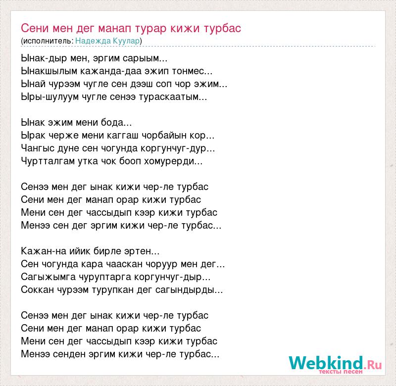 Ынак-дыр мен, эргим сарыым... Ынакшылым кажанда-даа эжип тонмес... Ынай чурээм чугле сен дээш соп чор эжим... Ыры-шулуум чугле сенээ тураскаатым... Ынак эжим мени бода... Ырак черже мени каггаш чорбайын кор... Чангыс дуне сен чогунда коргунчуг-дур... Чуртталгам утка чок бооп хомурерди... Сенээ мен дег ынак кижи чер-ле турбас Сени мен дег манап орар кижи турбас Мени сен дег чассыдып кээр кижи турбас Менээ сен дег эргим кижи чер-ле турбас... Кажан-на ийик бирле эртен... Сен чогунда кара чааскан чоруур мен дег... Сагыжымга чуруптарга коргунчуг-дыр... Соккан чурээм турупкан дег сагындырды... Сенээ мен дег ынак кижи чер-ле турбас Сени мен дег манап орар кижи турбас Мени сен дег чассыдып кээр кижи турбас Менээ сенден эргим кижи чер-ле турбас...