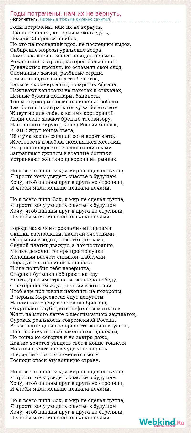 Годы потрачены, нам их не вернуть, Прошлое пепел, который можно сдуть, Позади 23 пропьи ошибок, Но это не последний вдох, не последний выдох, Сибирские морозы уральские ветра, Помотала жизнь, много повидал дерьма, Рожденный в стране, которой больше нет, Девяностые прошли, но оставили свой след, Сломанные жизни, разбитые сердца Грязные подъезды и дети без отца, Барыги - коммерсанты, товары из Афгана, Наживают капиталы на пакетах и стаканах, Ценные бумаги доллары, банкноты, Топ-менеджеры в офисах лишены свободы, Так боятся проиграть гонку за богатством Живут не для себя, а во имя корпораций Люди слепо хавают бред по телевизору, Нас гипнотизируют, конец России близок, В 2012 ждут конца света, Чё с ума все по сходили если верят в это, Жестокость и любовь поменялися местами, Вчерашние щенки сегодня стали псами Заправляют джинсы в военные ботинки Устраивают жесткие диверсии на рынках. Но я всего лишь Зэк, я мир не сделал лучше, Я просто хочу увидеть счастье в будущем Хочу, чтоб пацаны друг в друга не стреляли, И чтобы мама меньше плакала ночами. Но я всего лишь Зэк, я мир не сделал лучше, Я просто хочу увидеть счастье в будущем Хочу, чтоб пацаны друг в друга не стреляли, И чтобы мама меньше плакала ночами. Города захвачены рекламными щитами Скидки распродажи, налетай очередями, Оформляй кредит, советует реклама, Скупой платит дважды, а лох постоянно, Милые девочки теперь просто сучки Холодный расчет: силикон, каблучки, Порадуй её толщиной кошелька И она полюбит тебя наверняка, Старики бутылки собирают на еду Благодарна им страна за великую победу, С нетерпеньем ждут, пенсии крохотной Чтоб еще при жизни накопить на похороны, В черных Мерседесах едут депутаты Напоминая сцену из сериала бригада, Открывают клубы дети нефтяных магнатов Жить на много легче с шестизначною зарплатой, Суровая реальность современной России, Вокзальные дети все прелести жизни вкусили, И по любому это всё закончится однажды, Но точно не сегодня и не завтра даже, Как же хочется увидеть свет в конце тоннеля Но жизнь учит нас в чудеса не верить И вряд ли что-то я изменить смогу Господи спаси эту великую страну. Но я всего лишь Зэк, я мир не сделал лучше, Я просто хочу увидеть счастье в будущем Хочу, чтоб пацаны друг в друга не стреляли, И чтобы мама меньше плакала ночами. Но я всего лишь Зэк, я мир не сделал лучше, Я просто хочу увидеть счастье в будущем Хочу, чтоб пацаны друг в друга не стреляли, И чтобы мама меньше плакала ночами.