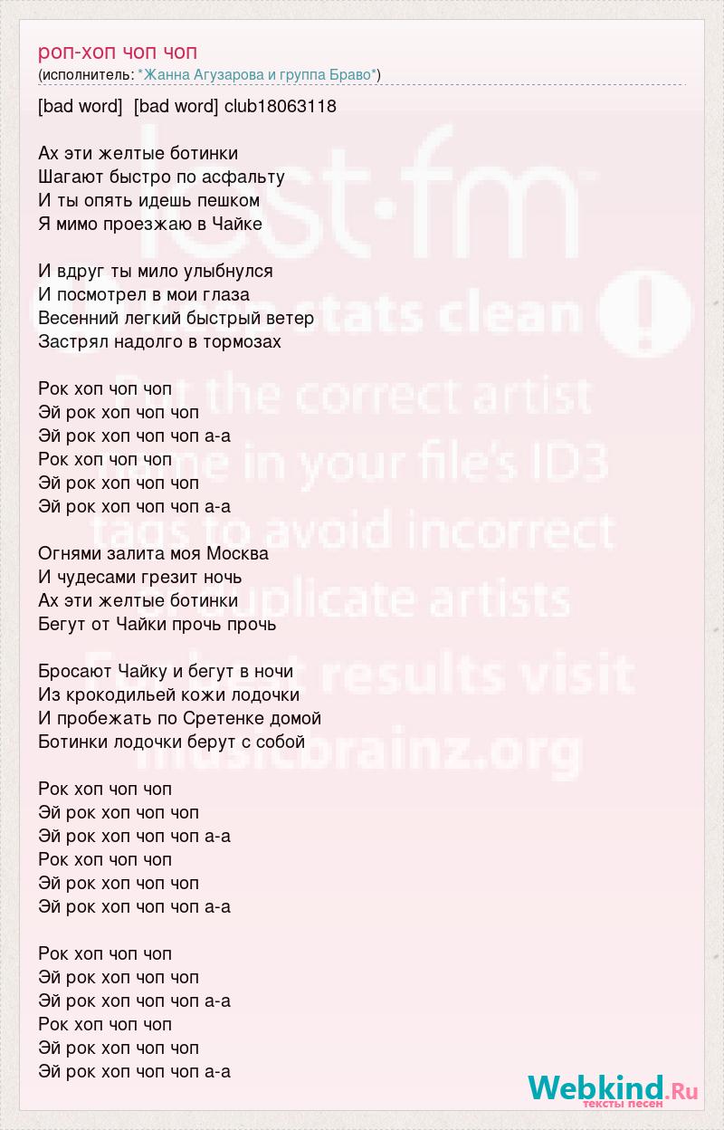 [bad word] [bad word] club18063118 Ах эти желтые ботинки Шагают быстро по асфальту И ты опять идешь пешком Я мимо проезжаю в Чайке И вдруг ты мило улыбнулся И посмотрел в мои глаза Весенний легкий быстрый ветер Застрял надолго в тормозах Рок хоп чоп чоп Эй рок хоп чоп чоп Эй рок хоп чоп чоп а-а Рок хоп чоп чоп Эй рок хоп чоп чоп Эй рок хоп чоп чоп а-а Огнями залита моя Москва И чудесами грезит ночь Ах эти желтые ботинки Бегут от Чайки прочь прочь Бросают Чайку и бегут в ночи Из крокодильей кожи лодочки И пробежать по Сретенке домой Ботинки лодочки берут с собой Рок хоп чоп чоп Эй рок хоп чоп чоп Эй рок хоп чоп чоп а-а Рок хоп чоп чоп Эй рок хоп чоп чоп Эй рок хоп чоп чоп а-а Рок хоп чоп чоп Эй рок хоп чоп чоп Эй рок хоп чоп чоп а-а Рок хоп чоп чоп Эй рок хоп чоп чоп Эй рок хоп чоп чоп а-а