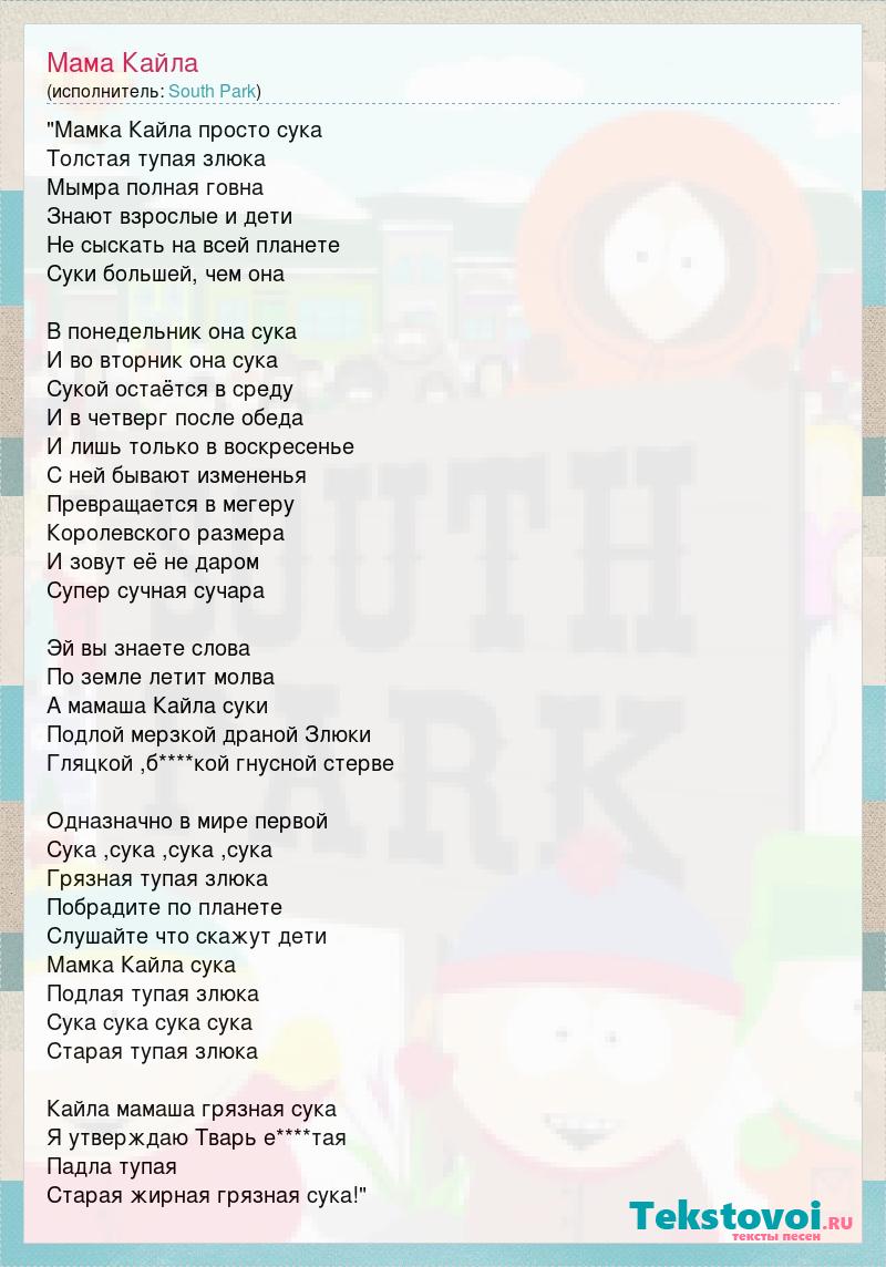 "Мамка Кайла просто сука Толстая тупая злюка Мымра полная говна Знают взрослые и дети Не сыскать на всей планете Суки большей, чем она В понедельник она сука И во вторник она сука Сукой остаётся в среду И в четверг после обеда И лишь только в воскресенье С ней бывают измененья Превращается в мегеру Королевского размера И зовут её не даром Супер сучная сучара Эй вы знаете слова По земле летит молва А мамаша Кайла суки Подлой мерзкой драной Злюки Гляцкой ,б****кой гнусной стерве Одназначно в мире первой Сука ,сука ,сука ,сука Грязная тупая злюка Побрадите по планете Слушайте что скажут дети Мамка Кайла сука Подлая тупая злюка Сука сука сука сука Старая тупая злюка Кайла мамаша грязная сука Я утверждаю Тварь е****тая Падла тупая Старая жирная грязная сука!"