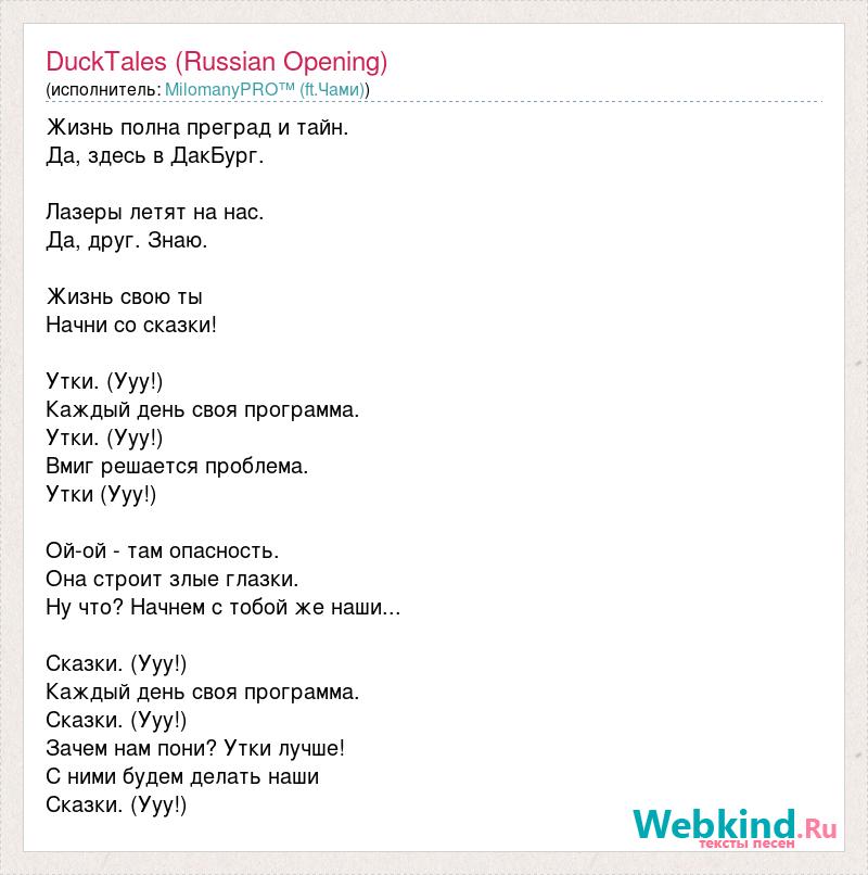 Жизнь полна преград и тайн. Да, здесь в ДакБург. Лазеры летят на нас. Да, друг. Знаю. Жизнь свою ты Начни со сказки! Утки. (Ууу!) Каждый день своя программа. Утки. (Ууу!) Вмиг решается проблема. Утки (Ууу!) Ой-ой - там опасность. Она строит злые глазки. Ну что? Начнем с тобой же наши... Сказки. (Ууу!) Каждый день своя программа. Сказки. (Ууу!) Зачем нам пони? Утки лучше! С ними будем делать наши Сказки. (Ууу!)