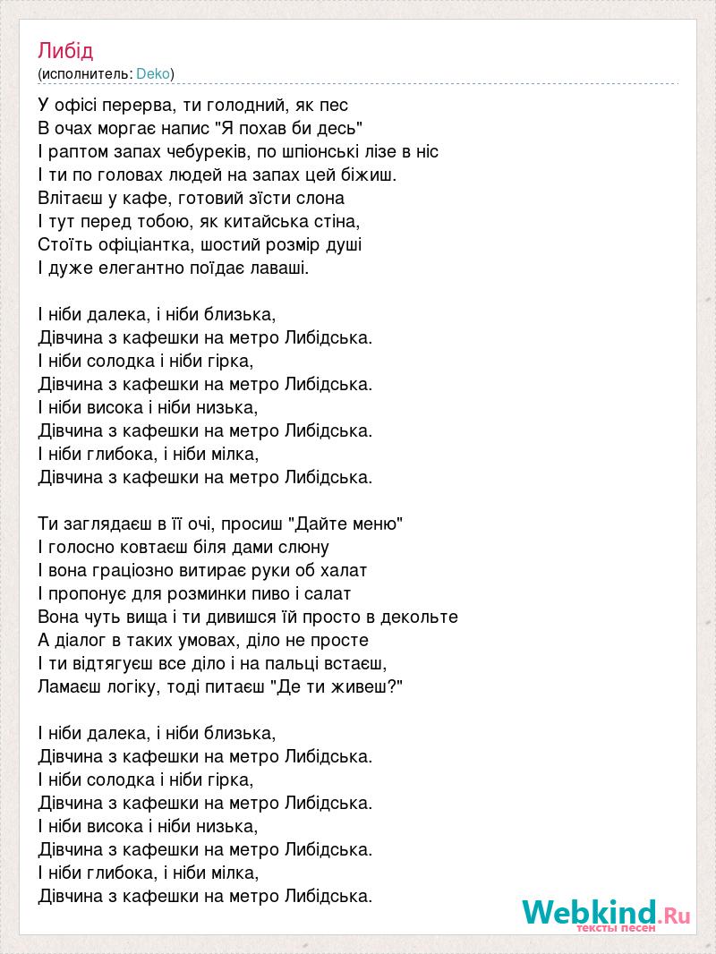 У офісі перерва, ти голодний, як пес В очах моргає напис "Я похав би десь" І раптом запах чебуреків, по шпіонські лізе в ніс І ти по головах людей на запах цей біжиш. Влітаєш у кафе, готовий зїсти слона І тут перед тобою, як китайська стіна, Стоїть офіціантка, шостий розмір душі І дуже елегантно поїдає лаваші. І ніби далека, і ніби близька, Дівчина з кафешки на метро Либідська. І ніби солодка і ніби гірка, Дівчина з кафешки на метро Либідська. І ніби висока і ніби низька, Дівчина з кафешки на метро Либідська. І ніби глибока, і ніби мілка, Дівчина з кафешки на метро Либідська. Ти заглядаєш в її очі, просиш "Дайте меню" І голосно ковтаєш біля дами слюну І вона граціозно витирає руки об халат І пропонує для розминки пиво і салат Вона чуть вища і ти дивишся їй просто в декольте А діалог в таких умовах, діло не просте І ти відтягуєш все діло і на пальці встаєш, Ламаєш логіку, тоді питаєш "Де ти живеш?" І ніби далека, і ніби близька, Дівчина з кафешки на метро Либідська. І ніби солодка і ніби гірка, Дівчина з кафешки на метро Либідська. І ніби висока і ніби низька, Дівчина з кафешки на метро Либідська. І ніби глибока, і ніби мілка, Дівчина з кафешки на метро Либідська.