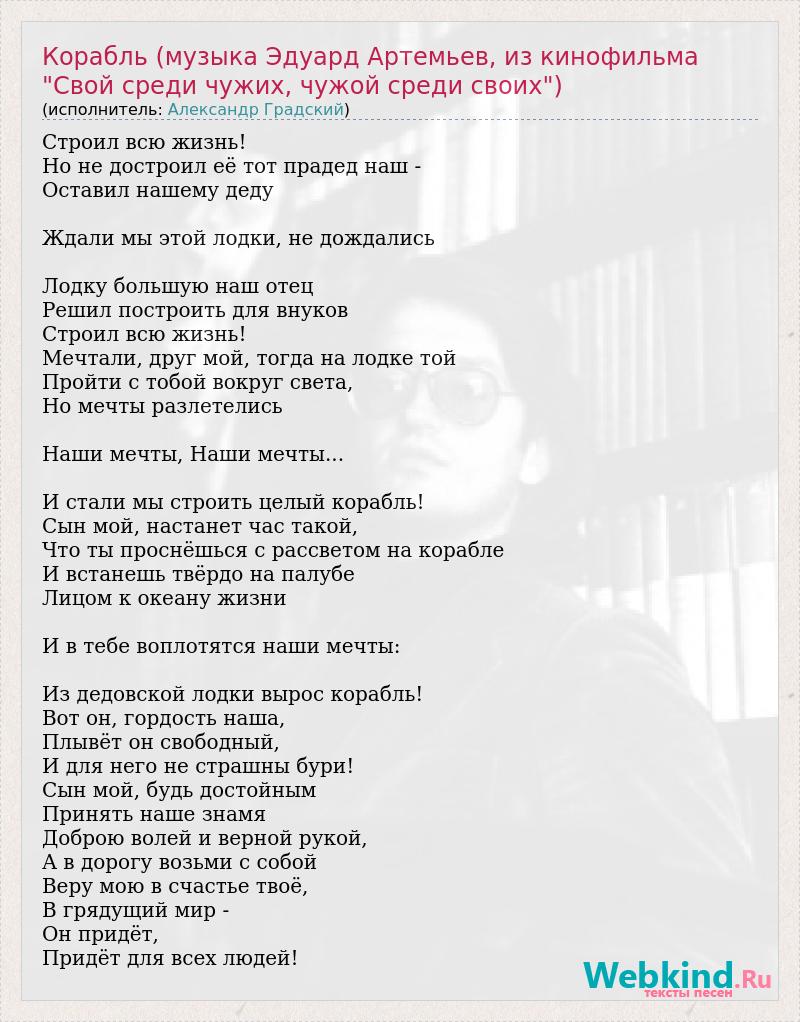 Главная→Исполнители→Александр Градский→Корабль (музыка Эдуард Артемьев, из кинофильма "Свой среди чужих, чужой среди св