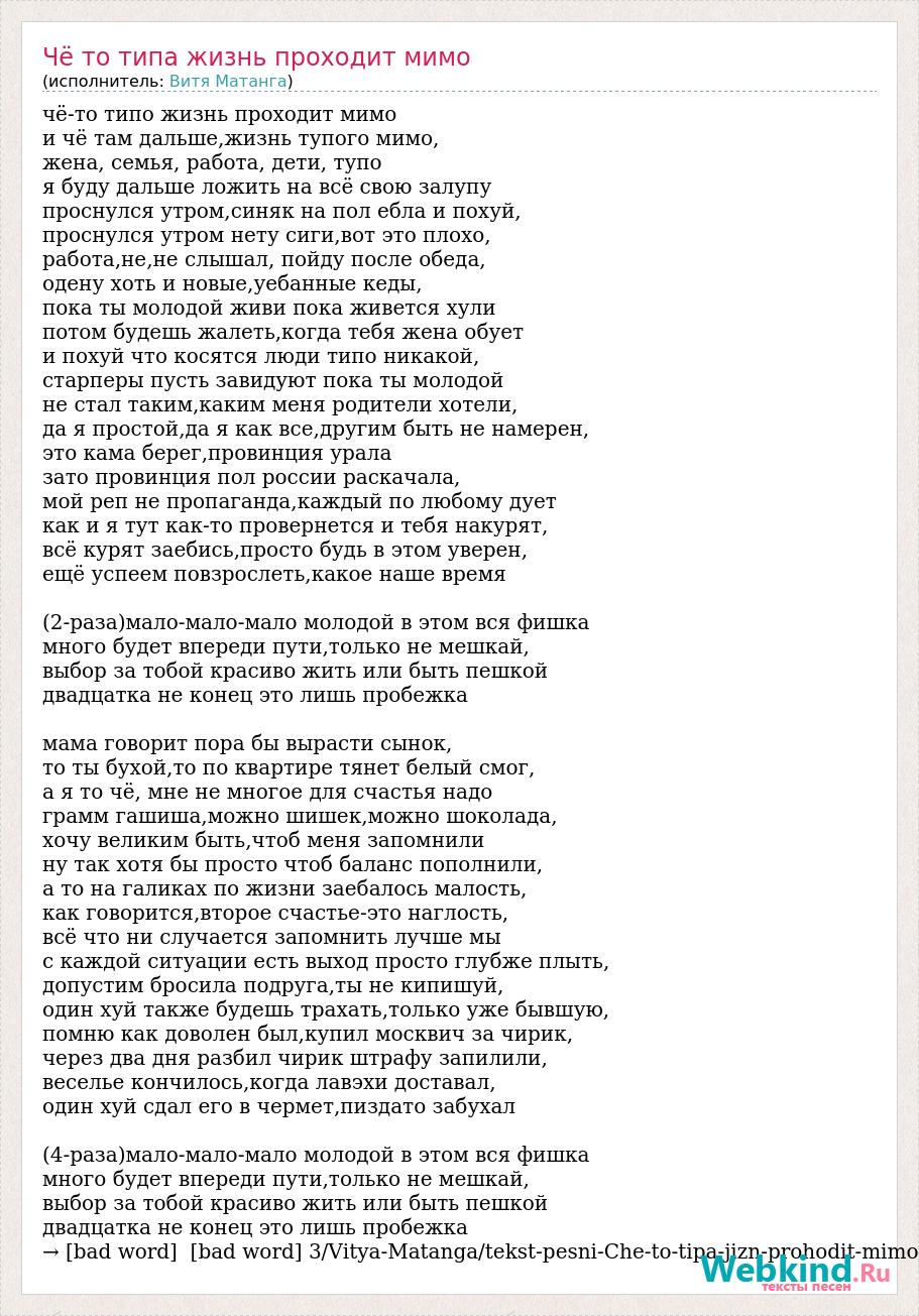 чё-то типо жизнь проходит мимо и чё там дальше,жизнь тупого мимо, жена, семья, работа, дети, тупо я буду дальше ложить на всё свою залупу проснулся утром,синяк на пол ебла и похуй, проснулся утром нету сиги,вот это плохо, работа,не,не слышал, пойду после обеда, одену хоть и новые,уебанные кеды, пока ты молодой живи пока живется хули потом будешь жалеть,когда тебя жена обует и похуй что косятся люди типо никакой, старперы пусть завидуют пока ты молодой не стал таким,каким меня родители хотели, да я простой,да я как все,другим быть не намерен, это кама берег,провинция урала зато провинция пол россии раскачала, мой реп не пропаганда,каждый по любому дует как и я тут как-то провернется и тебя накурят, всё курят заебись,просто будь в этом уверен, ещё успеем повзрослеть,какое наше время (2-раза)мало-мало-мало молодой в этом вся фишка много будет впереди пути,только не мешкай, выбор за тобой красиво жить или быть пешкой двадцатка не конец это лишь пробежка мама говорит пора бы вырасти сынок, то ты бухой,то по квартире тянет белый смог, а я то чё, мне не многое для счастья надо грамм гашиша,можно шишек,можно шоколада, хочу великим быть,чтоб меня запомнили ну так хотя бы просто чтоб баланс пополнили, а то на галиках по жизни заебалось малость, как говорится,второе счастье-это наглость, всё что ни случается запомнить лучше мы с каждой ситуации есть выход просто глубже плыть, допустим бросила подруга,ты не кипишуй, один хуй также будешь трахать,только уже бывшую, помню как доволен был,купил москвич за чирик, через два дня разбил чирик штрафу запилили, веселье кончилось,когда лавэхи доставал, один хуй сдал его в чермет,пиздато забухал (4-раза)мало-мало-мало молодой в этом вся фишка много будет впереди пути,только не мешкай, выбор за тобой красиво жить или быть пешкой двадцатка не конец это лишь пробежка → [bad word] [bad word] 3/Vitya-Matanga/tekst-pesni-Che-to-tipa-jizn-prohodit-mimo
