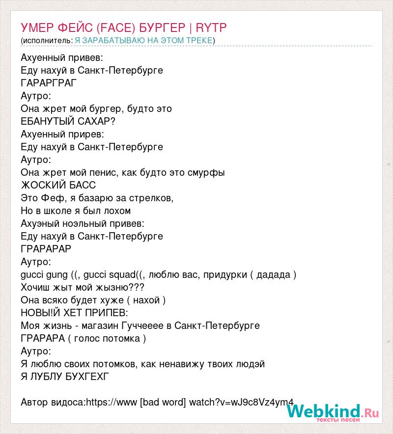 Ахуенный привев: Еду нахуй в Санкт-Петербурге ГАРАРГРАГ Аутро: Она жрет мой бургер, будто это ЕБАНУТЫЙ САХАР? Ахуенный прирев: Еду нахуй в Санкт-Петербурге Аутро: Она жрет мой пенис, как будто это смурфы ЖОСКИЙ БАСС Это Феф, я базарю за стрелков, Но в школе я был лохом Ахуэный ноэльный привев: Еду нахуй в Санкт-Петербурге ГРАРАРАР Аутро: gucci gung ((, gucci squad((, люблю вас, придурки ( дадада ) Хочиш жыт мой жызню??? Она всяко будет хуже ( нахой ) НОВЫ!Й ХЕТ ПРИПЕВ: Моя жизнь - магазин Гуччееее в Санкт-Петербурге ГРАРАРА ( голос потомка ) Аутро: Я люблю своих потомков, как ненавижу твоих людэй Я ЛУБЛУ БУХГЕХГ Автор видоса:https://www [bad word] watch?v=wJ9c8Vz4ym4