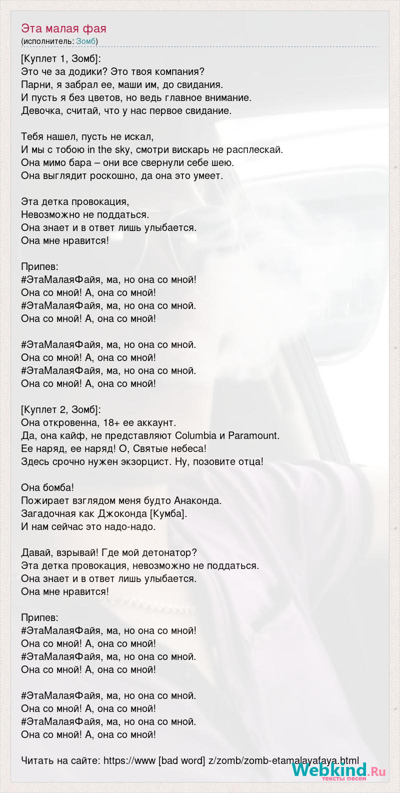 [Куплет 1, Зомб]: Это че за додики? Это твоя компания? Парни, я забрал ее, маши им, до свидания. И пусть я без цветов, но ведь главное внимание. Девочка, считай, что у нас первое свидание. Тебя нашел, пусть не искал, И мы с тобою in the sky, смотри вискарь не расплескай. Она мимо бара – они все свернули себе шею. Она выглядит роскошно, да она это умеет. Эта детка провокация, Невозможно не поддаться. Она знает и в ответ лишь улыбается. Она мне нравится! Припев: #ЭтаМалаяФайя, ма, но она со мной! Она со мной! А, она со мной! #ЭтаМалаяФайя, ма, но она со мной. Она со мной! А, она со мной! #ЭтаМалаяФайя, ма, но она со мной. Она со мной! А, она со мной! #ЭтаМалаяФайя, ма, но она со мной. Она со мной! А, она со мной! [Куплет 2, Зомб]: Она откровенна, 18+ ее аккаунт. Да, она кайф, не представляют Columbia и Paramount. Ее наряд, ее наряд! О, Святые небеса! Здесь срочно нужен экзорцист. Ну, позовите отца! Она бомба! Пожирает взглядом меня будто Анаконда. Загадочная как Джоконда [Кумба]. И нам сейчас это надо-надо. Давай, взрывай! Где мой детонатор? Эта детка провокация, невозможно не поддаться. Она знает и в ответ лишь улыбается. Она мне нравится! Припев: #ЭтаМалаяФайя, ма, но она со мной! Она со мной! А, она со мной! #ЭтаМалаяФайя, ма, но она со мной. Она со мной! А, она со мной! #ЭтаМалаяФайя, ма, но она со мной. Она со мной! А, она со мной! #ЭтаМалаяФайя, ма, но она со мной. Она со мной! А, она со мной! Читать на сайте: https://www [bad word] z/zomb/zomb-etamalayafaya.html