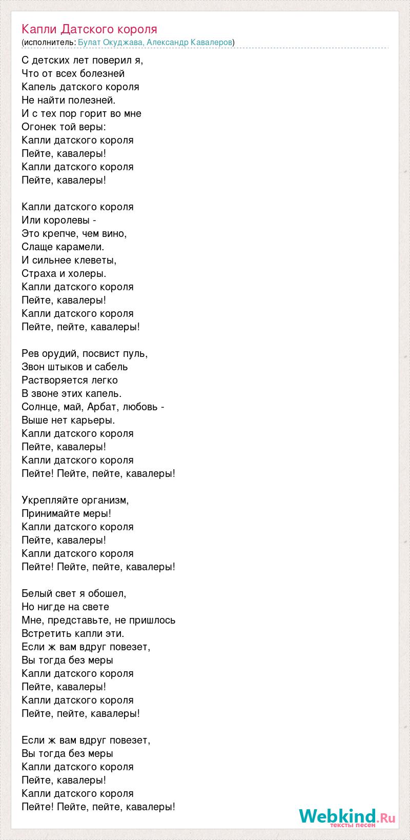 С детских лет поверил я, Что от всех болезней Капель датского короля Не найти полезней. И с тех пор горит во мне Огонек той веры: Капли датского короля Пейте, кавалеры! Капли датского короля Пейте, кавалеры! Капли датского короля Или королевы - Это крепче, чем вино, Слаще карамели. И сильнее клеветы, Страха и холеры. Капли датского короля Пейте, кавалеры! Капли датского короля Пейте, пейте, кавалеры! Рев орудий, посвист пуль, Звон штыков и сабель Растворяется легко В звоне этих капель. Солнце, май, Арбат, любовь - Выше нет карьеры. Капли датского короля Пейте, кавалеры! Капли датского короля Пейте! Пейте, пейте, кавалеры! Укрепляйте организм, Принимайте меры! Капли датского короля Пейте, кавалеры! Капли датского короля Пейте! Пейте, пейте, кавалеры! Белый свет я обошел, Но нигде на свете Мне, представьте, не пришлось Встретить капли эти. Если ж вам вдруг повезет, Вы тогда без меры Капли датского короля Пейте, кавалеры! Капли датского короля Пейте, пейте, кавалеры! Если ж вам вдруг повезет, Вы тогда без меры Капли датского короля Пейте, кавалеры! Капли датского короля Пейте! Пейте, пейте, кавалеры!