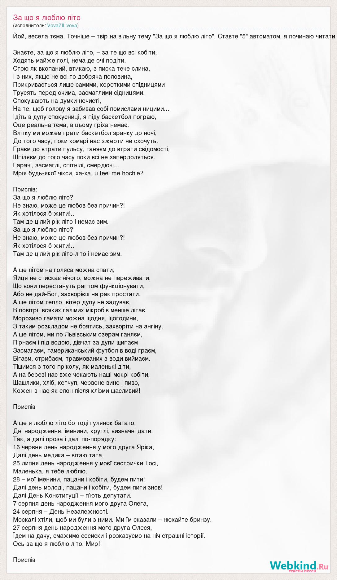 Йой, весела тєма. Точніше – твір на вільну тему "За що я люблю літо". Ставте "5" автоматом, я починаю читати. Знаєте, за що я люблю літо, – за те що всі кобіти, Ходять майже голі, нема де очі подіти. Стою як вкопаний, втикаю, з писка тече слина, І з них, якщо не всі то добряча половина, Прикривається лише самими, короткими спідницями Трусять перед очима, засмаглими сідницями. Спокушають на думки нечисті, На те, щоб голову я забивав собі помислами ницими... Ідіть в дупу спокусниці, я піду баскетбол пограю, Оце реальна тєма, в цьому гріха немає. Влітку ми можем грати баскетбол зранку до ночі, До того часу, поки комарі нас зжерти не схочуть. Граєм до втрати пульсу, ганяєм до втрати свідомості, Шпіляєм до того часу поки всі не запердоляться. Гарячі, засмаглі, спітнілі, смердючі... Мрія будь-якої чікси, ха-ха, u feel me hochie? Приспів: За що я люблю літо? Не знаю, може це любов без причин?! Як хотілося б жити!.. Там де цілий рік літо і немає зим. За що я люблю літо? Не знаю, може це любов без причин?! Як хотілося б жити!.. Там де цілий рік літо-літо і немає зим. А ще літом на голяса можна спати, Яйця не стискає нічого, можна не переживати, Що вони перестануть раптом функціонувати, Або не дай-Бог, захворієш на рак простати. А ще літом тепло, вітер дупу не задуває, В повітрі, всяких галімих мікробів менше літає. Морозиво гамати можна щодня, щогодини, З таким розкладом не боятись, захворіти на ангіну. А ще літом, ми по Львівським озерам ганяєм, Пірнаєм і під водою, дівчат за дупи щипаєм Засмагаєм, гамериканський футбол в воді граєм, Бігаєм, стрибаєм, травмованих з води виймаєм. Тішимся з того пріколу, як маленькі діти, А на березі нас вже чекають наші мокрі кобіти, Шашлики, хліб, кетчуп, червоне вино і пиво, Кожен з нас як слон після клізми щасливий! Приспів А ще я люблю літо бо тоді гулянок багато, Дні народження, іменини, круглі, визначні дати. Так, а далі проза і далі по-порядку: 16 червня день народження у мого друга Яріка, Далі день медика – вітаю тата, 25 липня день народження у моєї сестрички Тосі, Маленька, я тебе люблю. 28 – мої іменини, пацани і кобіти, будем пити! Далі день молоді, пацани і кобіти, будем пити знов! Далі День Конституції – п’ють депутати. 7 серпня день народження мого друга Олега, 24 серпня – День Незалежності. Москалі хтіли, щоб ми були з ними. Ми їм сказали – нюхайте бринзу. 27 серпня день народження мого друга Олеся, Їдем на дачу, смажимо сосиски і розказуємо на ніч страшні історії. Ось за що я люблю літо. Мир! Приспів