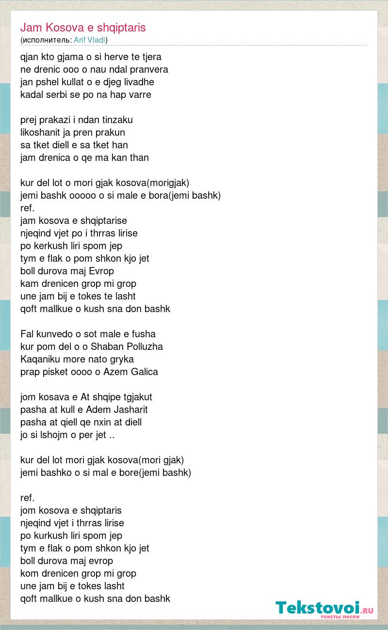 qjan kto gjama o si herve te tjera ne drenic ooo o nau ndal pranvera jan pshel kullat o e djeg livadhe kadal serbi se po na hap varre prej prakazi i ndan tinzaku likoshanit ja pren prakun sa tket diell e sa tket han jam drenica o qe ma kan than kur del lot o mori gjak kosova(morigjak) jemi bashk ooooo o si male e bora(jemi bashk) ref. jam kosova e shqiptarise njeqind vjet po i thrras lirise po kerkush liri spom jep tym e flak o pom shkon kjo jet boll durova maj Evrop kam drenicen grop mi grop une jam bij e tokes te lasht qoft mallkue o kush sna don bashk Fal kunvedo o sot male e fusha kur pom del o o Shaban Polluzha Kaqaniku more nato gryka prap pisket oooo o Azem Galica jom kosava e At shqipe tgjakut pasha at kull e Adem Jasharit pasha at qiell qe nxin at diell jo si lshojm o per jet .. kur del lot mori gjak kosova(mori gjak) jemi bashko o si mal e bore(jemi bashk) ref. jom kosova e shqiptaris njeqind vjet i thrras lirise po kurkush liri spom jep tym e flak o pom shkon kjo jet boll durova maj evrop kom drenicen grop mi grop une jam bij e tokes lasht qoft mallkue o kush sna don bashk