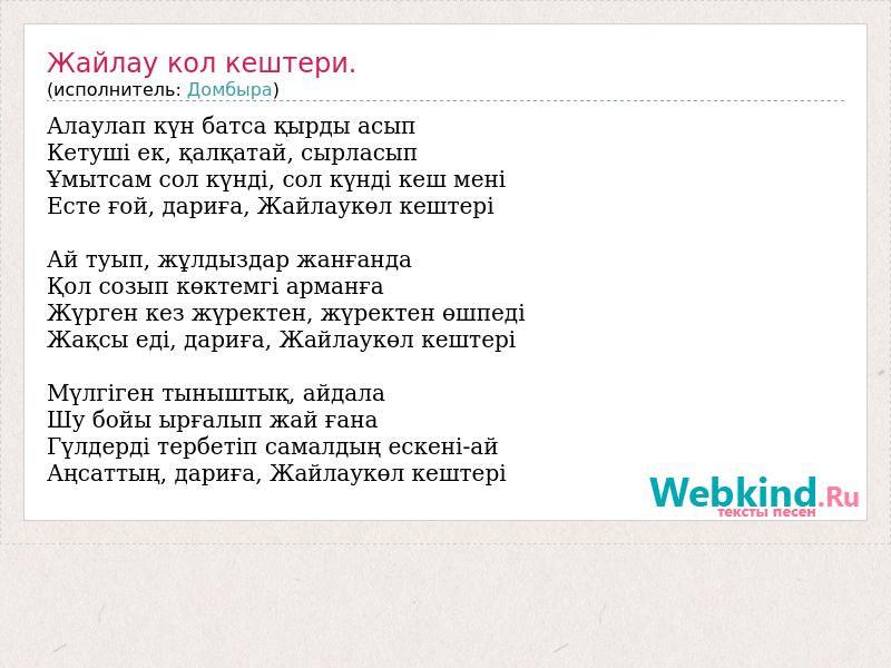 Алаулап күн батса қырды асып Кетуші ек, қалқатай, сырласып Ұмытсам сол күнді, сол күнді кеш мені Есте ғой, дариға, Жайлаукөл кештері Ай туып, жұлдыздар жанғанда Қол созып көктемгі арманға Жүрген кез жүректен, жүректен өшпеді Жақсы еді, дариға, Жайлаукөл кештері Мүлгіген тыныштық, айдала Шу бойы ырғалып жай ғана Гүлдерді тербетіп самалдың ескені-ай Аңсаттың, дариға, Жайлаукөл кештері