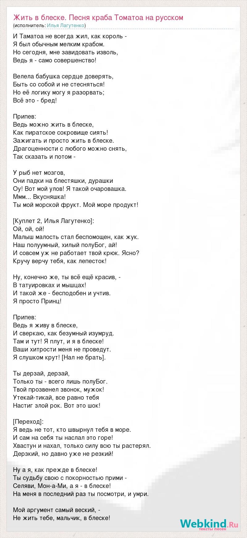 И Таматоа не всегда жил, как король - Я был обычным мелким крабом. Но сегодня, мне завидовать изволь, Ведь я - само совершенство! Велела бабушка сердце доверять, Быть со собой и не стесняться! Но её логику могу я разорвать; Всё это - бред! Припев: Ведь можно жить в блеске, Как пиратское сокровище сиять! Зажигать и просто жить в блеске. Драгоценности с любого можно снять, Так сказать и потом - У рыб нет мозгов, Они падки на блестяшки, дурашки Оу! Вот мой улов! Я такой очаровашка. Ммм... Вкусняшка! Ты мой морской фрукт. Мой море продукт! [Куплет 2, Илья Лагутенко]: Ой, ой, ой! Малыш малость стал беспомощен, как жук. Наш полуумный, хилый полуБог, ай! И совсем уж не работает твой крюк. Ясно? Кручу верчу тебя, как лепесток! Ну, конечно же, ты всё ещё красив, - В татуировках и мышцах! И такой же - бесподобен и учтив. Я просто Принц! Припев: Ведь я живу в блеске, И сверкаю, как безумный изумруд. Там и тут! Я плут, и я в блеске! Ваши хитрости меня не проведут. Я слушком крут! [Нал не брать]. Ты дерзай, дерзай, Только ты - всего лишь полуБог. Твой прозвенел звонок, мужок! Утекай-тикай, все равно тебя Настиг злой рок. Вот это шок! [Переход]: Я ведь не тот, кто швырнул тебя в море. И сам на себя ты наслал это горе! Хвастун и нахал, только силу всю ты растерял. Дерзкий, но давно уже не резкий! Ну а я, как прежде в блеске! Ты судьбу свою с покорностью прими - Селяви, Мон-а-Ми, а я - в блеске! На меня в последний раз ты посмотри, и умри. Мой аргумент самый веский, - Не жить тебе, мальчик, в блеске!