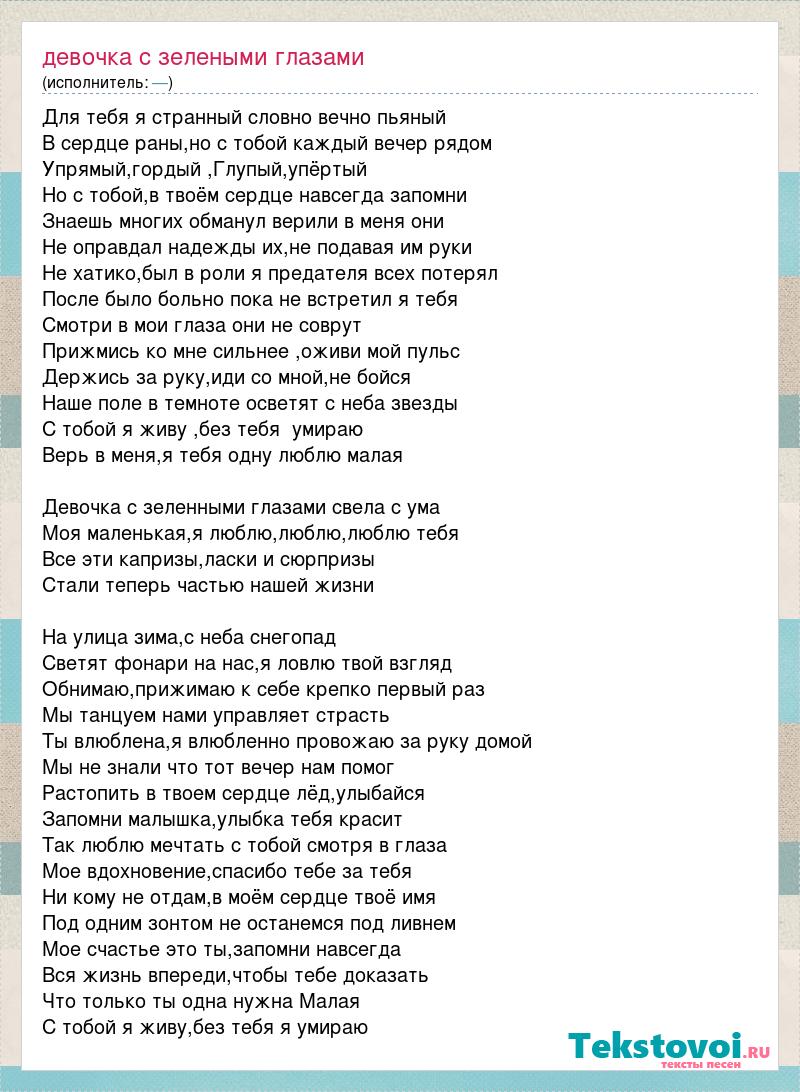 Для тебя я странный словно вечно пьяный В сердце раны,но с тобой каждый вечер рядом Упрямый,гордый ,Глупый,упёртый Но с тобой,в твоём сердце навсегда запомни Знаешь многих обманул верили в меня они Не оправдал надежды их,не подавая им руки Не хатико,был в роли я предателя всех потерял После было больно пока не встретил я тебя Смотри в мои глаза они не соврут Прижмись ко мне сильнее ,оживи мой пульс Держись за руку,иди со мной,не бойся Наше поле в темноте осветят с неба звезды С тобой я живу ,без тебя умираю Верь в меня,я тебя одну люблю малая Девочка с зеленными глазами свела с ума Моя маленькая,я люблю,люблю,люблю тебя Все эти капризы,ласки и сюрпризы Стали теперь частью нашей жизни На улица зима,с неба снегопад Светят фонари на нас,я ловлю твой взгляд Обнимаю,прижимаю к себе крепко первый раз Мы танцуем нами управляет страсть Ты влюблена,я влюбленно провожаю за руку домой Мы не знали что тот вечер нам помог Растопить в твоем сердце лёд,улыбайся Запомни малышка,улыбка тебя красит Так люблю мечтать с тобой смотря в глаза Мое вдохновение,спасибо тебе за тебя Ни кому не отдам,в моём сердце твоё имя Под одним зонтом не останемся под ливнем Мое счастье это ты,запомни навсегда Вся жизнь впереди,чтобы тебе доказать Что только ты одна нужна Малая С тобой я живу,без тебя я умираю