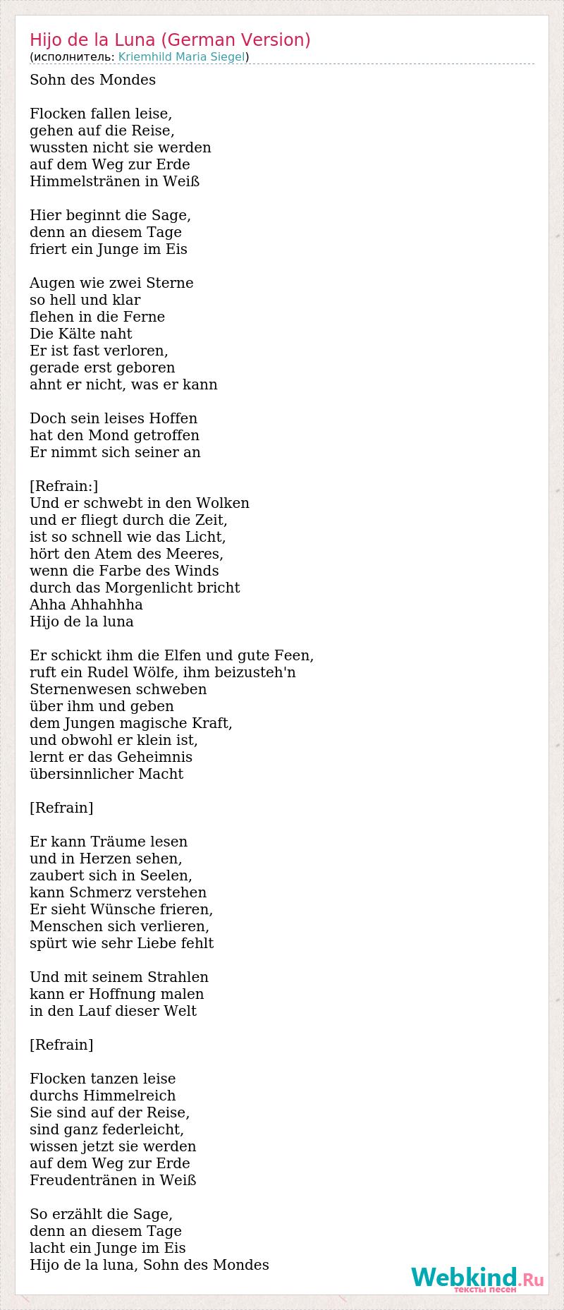Sohn des Mondes Flocken fallen leise, gehen auf die Reise, wussten nicht sie werden auf dem Weg zur Erde Himmelstränen in Weiß Hier beginnt die Sage, denn an diesem Tage friert ein Junge im Eis Augen wie zwei Sterne so hell und klar flehen in die Ferne Die Kälte naht Er ist fast verloren, gerade erst geboren ahnt er nicht, was er kann Doch sein leises Hoffen hat den Mond getroffen Er nimmt sich seiner an [Refrain:] Und er schwebt in den Wolken und er fliegt durch die Zeit, ist so schnell wie das Licht, hört den Atem des Meeres, wenn die Farbe des Winds durch das Morgenlicht bricht Ahha Ahhahhha Hijo de la luna Er schickt ihm die Elfen und gute Feen, ruft ein Rudel Wölfe, ihm beizusteh'n Sternenwesen schweben über ihm und geben dem Jungen magische Kraft, und obwohl er klein ist, lernt er das Geheimnis übersinnlicher Macht [Refrain] Er kann Träume lesen und in Herzen sehen, zaubert sich in Seelen, kann Schmerz verstehen Er sieht Wünsche frieren, Menschen sich verlieren, spürt wie sehr Liebe fehlt Und mit seinem Strahlen kann er Hoffnung malen in den Lauf dieser Welt [Refrain] Flocken tanzen leise durchs Himmelreich Sie sind auf der Reise, sind ganz federleicht, wissen jetzt sie werden auf dem Weg zur Erde Freudentränen in Weiß So erzählt die Sage, denn an diesem Tage lacht ein Junge im Eis Hijo de la luna, Sohn des Mondes