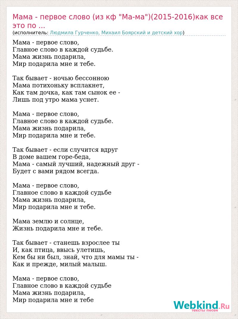 Мама - первое слово, Главное слово в каждой судьбе. Мама жизнь подарила, Мир подарила мне и тебе. Так бывает - ночью бессонною Мама потихоньку всплакнет, Как там дочка, как там сынок ее - Лишь под утро мама уснет. Мама - первое слово, Главное слово в каждой судьбе. Мама жизнь подарила, Мир подарила мне и тебе. Так бывает - если случится вдруг В доме вашем горе-беда, Мама - самый лучший, надежный друг - Будет с вами рядом всегда. Мама - первое слово, Главное слово в каждой судьбе Мама жизнь подарила, Мир подарила мне и тебе. Мама землю и солнце, Жизнь подарила мне и тебе. Так бывает - станешь взрослее ты И, как птица, ввысь улетишь, Кем бы ни был, знай, что для мамы ты - Как и прежде, милый малыш. Мама - первое слово, Главное слово в каждой судьбе Мама жизнь подарила, Мир подарила мне и тебе