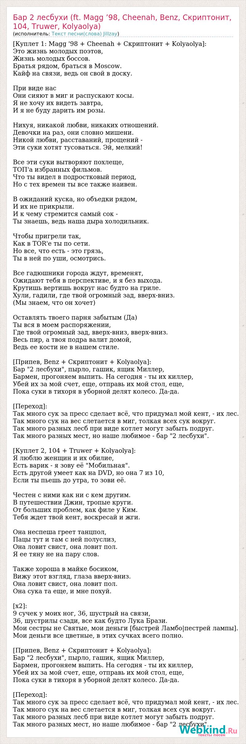 [Куплет 1: Magg '98 + Cheenah + Скриптонит + Kolyaolya]: Это жизнь молодых поэтов, Жизнь молодых боссов. Братья рядом, браться в Moscow. Кайф на связи, ведь он свой в доску. При виде нас Они сияют в миг и распускают косы. Я не хочу их видеть завтра, И я не буду дарить им розы. Нихуя, никакой любви, никаких отношений. Девочки на раз, они словно мишени. Никой любви, расставаний, прощений - Эти суки хотят тусоваться. Эй, мелкий! Все эти суки вытворяют похлеще, ТОП'а избранных фильмов. Что ты видел в подростковый период, Но с тех времен ты все также наивен. В ожиданий куска, но объедки рядом, И их не прикрыли. И к чему стремится самый сок - Ты знаешь, ведь наша дыра холодильник. Чтобы пригрели так, Как в TOR'е ты по сети. Но все, что есть - это грязь, Ты в ней по уши, осмотрись. Все гадюшники города ждут, временят, Ожидают тебя в перспективе, и я без выхода. Крутишь вертишь вокруг нас будто на гриле. Хули, гадили, где твой огромный зад, вверх-вниз. (Мы знаем, что он хочет) Оставлять твоего парня забытым (Да) Ты вся в моем распоряжении, Где твой огромный зад, вверх-вниз, вверх-вниз. Весь пир, а твоя подра валит домой, Ведь ее кости не в нашем стиле. [Припев, Benz + Скриптонит + Kolyaolya]: Бар "2 лесбухи", пырло, гашик, ящик Миллер, Бармен, прогоняем выпить. На сегодня - ты их киллер, Убей их за мой счет, еще, отправь их мой стол, еще, Пока суки в тихоря в уборной делят колесо. Да-да. [Переход]: Так много сук за пресс сделает всё, что придумал мой кент, - их лес. Так много сук на вес слетается в миг, толкая всех сук вокруг. Так много разных лесб при виде котлет могут забыть подруг. Так много разных мест, но наше любимое - бар "2 лесбухи". [Куплет 2, 104 + Truwer + Kolyaolya]: Я люблю женщин и их обилие, Есть варик - я зову её "Мобильная". Есть другой умеет как на DVD, но она 7 из 10, Если ты пьешь до утра, то зови её. Честен с ними как ни с кем другим. В путешествии Джин, тропые круги. От больших проблем, как филе у Ким. Тебя ждет твой кент, воскресай и жги. Она неспеша греет танцпол, Пацы тут и там с ней полуслиз, Она ловит свист, она ловит пол. Я ее тяну не на пару слов. Также хороша в майке босиком, Вижу этот взгляд, глаза вверх-вниз. Она ловит свист, она ловит пол. Она сука та еще, и мне похуй. [х2]: 9 сучек у моих ног, 36, шустрый на связи, 36, шустрилы сзади, все как будто Лука Брази. Мои сестры не Святые, мои деньги [быстрей Ламбо|пестрей лампы]. Мои деньги все цветные, в этих сучках всего полно. [Припев, Benz + Скриптонит + Kolyaolya]: Бар "2 лесбухи", пырло, гашик, ящик Миллер, Бармен, прогоняем выпить. На сегодня - ты их киллер, Убей их за мой счет, еще, отправь их мой стол, еще, Пока суки в тихоря в уборной делят колесо. Да-да. [Переход]: Так много сук за пресс сделает всё, что придумал мой кент, - их лес. Так много сук на вес слетается в миг, толкая всех сук вокруг. Так много разных лесб при виде котлет могут забыть подруг. Так много разных мест, но наше любимое - бар "2 лесбухи".