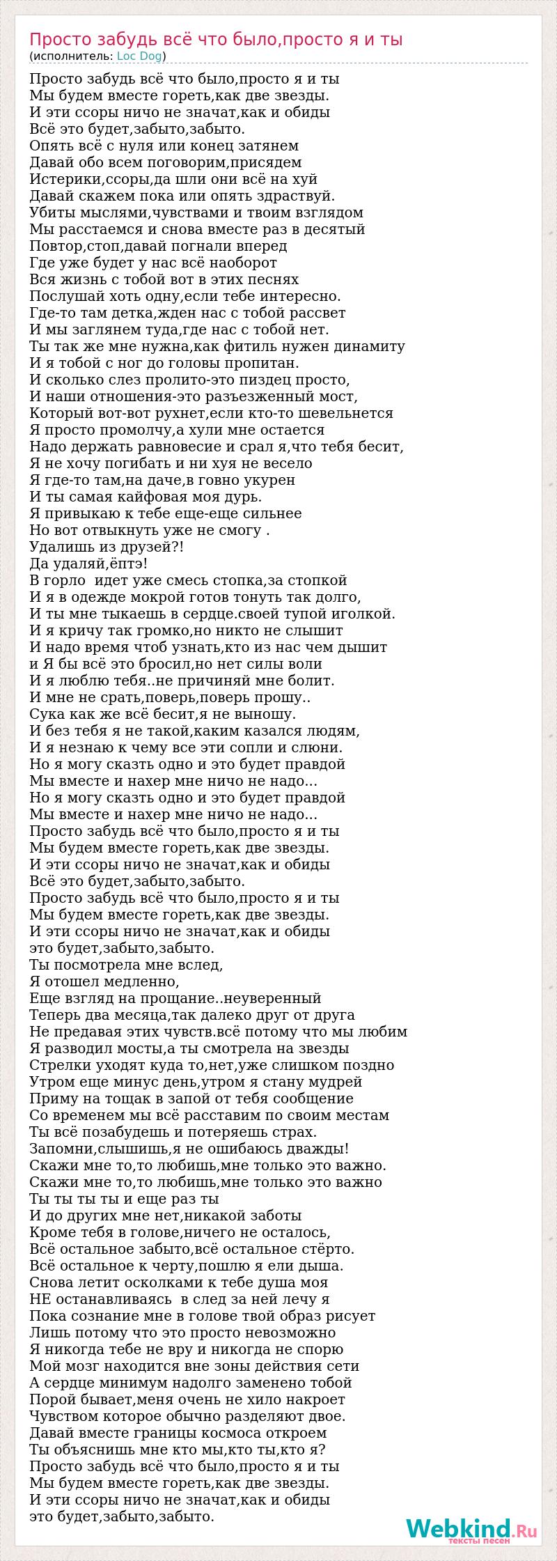 Просто забудь всё что было,просто я и ты Мы будем вместе гореть,как две звезды. И эти ссоры ничо не значат,как и обиды Всё это будет,забыто,забыто. Опять всё с нуля или конец затянем Давай обо всем поговорим,присядем Истерики,ссоры,да шли они всё на хуй Давай скажем пока или опять здраствуй. Убиты мыслями,чувствами и твоим взглядом Мы расстаемся и снова вместе раз в десятый Повтор,стоп,давай погнали вперед Где уже будет у нас всё наоборот Вся жизнь с тобой вот в этих песнях Послушай хоть одну,если тебе интересно. Где-то там детка,жден нас с тобой рассвет И мы заглянем туда,где нас с тобой нет. Ты так же мне нужна,как фитиль нужен динамиту И я тобой с ног до головы пропитан. И сколько слез пролито-это пиздец просто, И наши отношения-это разъезженный мост, Который вот-вот рухнет,если кто-то шевельнется Я просто промолчу,а хули мне остается Надо держать равновесие и срал я,что тебя бесит, Я не хочу погибать и ни хуя не весело Я где-то там,на даче,в говно укурен И ты самая кайфовая моя дурь. Я привыкаю к тебе еще-еще сильнее Но вот отвыкнуть уже не смогу . Удалишь из друзей?! Да удаляй,ёптэ! В горло идет уже смесь стопка,за стопкой И я в одежде мокрой готов тонуть так долго, И ты мне тыкаешь в сердце.своей тупой иголкой. И я кричу так громко,но никто не слышит И надо время чтоб узнать,кто из нас чем дышит и Я бы всё это бросил,но нет силы воли И я люблю тебя..не причиняй мне болит. И мне не срать,поверь,поверь прошу.. Сука как же всё бесит,я не выношу. И без тебя я не такой,каким казался людям, И я незнаю к чему все эти сопли и слюни. Но я могу сказть одно и это будет правдой Мы вместе и нахер мне ничо не надо... Но я могу сказть одно и это будет правдой Мы вместе и нахер мне ничо не надо... Просто забудь всё что было,просто я и ты Мы будем вместе гореть,как две звезды. И эти ссоры ничо не значат,как и обиды Всё это будет,забыто,забыто. Просто забудь всё что было,просто я и ты Мы будем вместе гореть,как две звезды. И эти ссоры ничо не значат,как и обиды это будет,забыто,забыто. Ты посмотрела мне вслед, Я отошел медленно, Еще взгляд на прощание..неуверенный Теперь два месяца,так далеко друг от друга Не предавая этих чувств.всё потому что мы любим Я разводил мосты,а ты смотрела на звезды Стрелки уходят куда то,нет,уже слишком поздно Утром еще минус день,утром я стану мудрей Приму на тощак в запой от тебя сообщение Со временем мы всё расставим по своим местам Ты всё позабудешь и потеряешь страх. Запомни,слышишь,я не ошибаюсь дважды! Скажи мне то,то любишь,мне только это важно. Скажи мне то,то любишь,мне только это важно Ты ты ты ты и еще раз ты И до других мне нет,никакой заботы Кроме тебя в голове,ничего не осталось, Всё остальное забыто,всё остальное стёрто. Всё остальное к черту,пошлю я ели дыша. Снова летит осколками к тебе душа моя НЕ останавливаясь в след за ней лечу я Пока сознание мне в голове твой образ рисует Лишь потому что это просто невозможно Я никогда тебе не вру и никогда не спорю Мой мозг находится вне зоны действия сети А сердце минимум надолго заменено тобой Порой бывает,меня очень не хило накроет Чувством которое обычно разделяют двое. Давай вместе границы космоса откроем Ты объяснишь мне кто мы,кто ты,кто я? Просто забудь всё что было,просто я и ты Мы будем вместе гореть,как две звезды. И эти ссоры ничо не значат,как и обиды это будет,забыто,забыто.