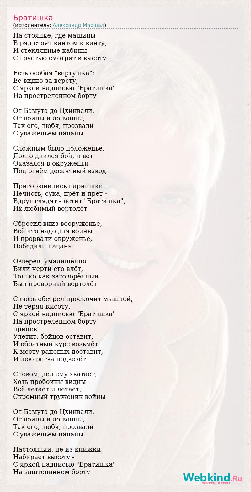На стоянке, где машины В ряд стоят винтом к винту, И стеклянные кабины С грустью смотрят в высоту Есть особая "вертушка": Её видно за версту, С яркой надписью "Братишка" На простреленном борту От Бамута до Цхинвали, От войны и до войны, Так его, любя, прозвали С уваженьем пацаны Сложным было положенье, Долго длился бой, и вот Оказался в окруженьи Под огнём десантный взвод Пригорюнились парнишки: Нечисть, сука, прёт и прёт - Вдруг глядят - летит "Братишка", Их любимый вертолёт Сбросил вниз вооруженье, Всё что надо для войны, И прорвали окруженье, Победили пацаны Озверев, умалишённо Били черти его влёт, Только как заговорённый Был проворный вертолёт Сквозь обстрел проскочит мышкой, Не теряя высоту, С яркой надписью "Братишка" На простреленном борту припев Улетит, бойцов оставит, И обратный курс возьмёт, К месту раненых доставит, И лекарства подвезёт Словом, дел ему хватает, Хоть пробоины видны - Всё летает и летает, Скромный труженик войны От Бамута до Цхинвали, От войны и до войны, Так его, любя, прозвали С уваженьем пацаны Настоящий, не из книжки, Набирает высоту - С яркой надписью "Братишка" На заштопанном борту