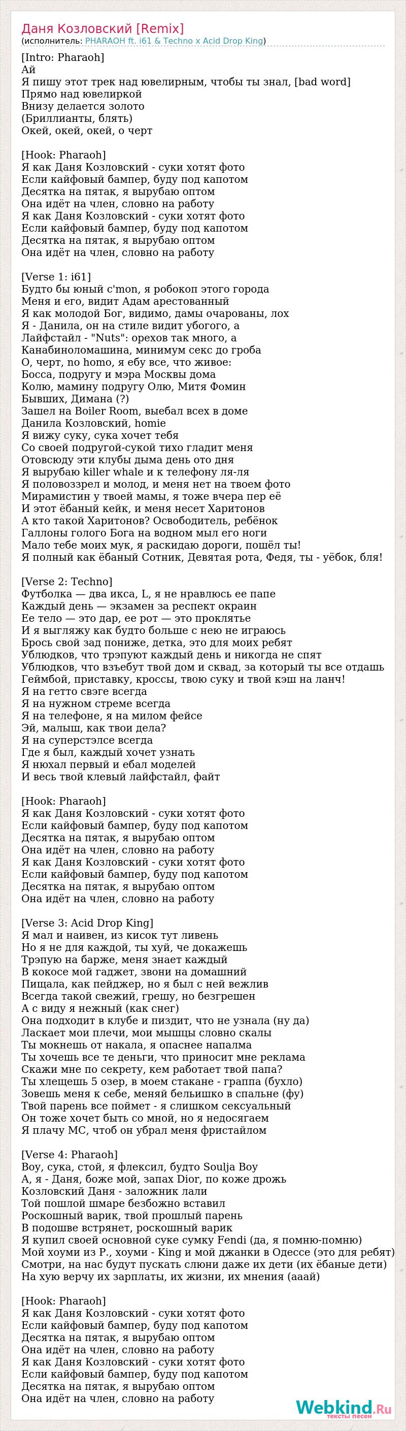 [Intro: Pharaoh] Ай Я пишу этот трек над ювелирным, чтобы ты знал, [bad word] Прямо над ювелиркой Внизу делается золото (Бриллианты, блять) Окей, окей, окей, о черт [Hook: Pharaoh] Я как Даня Козловский - суки хотят фото Если кайфовый бампер, буду под капотом Десятка на пятак, я вырубаю оптом Она идёт на член, словно на работу Я как Даня Козловский - суки хотят фото Если кайфовый бампер, буду под капотом Десятка на пятак, я вырубаю оптом Она идёт на член, словно на работу [Verse 1: i61] Будто бы юный c'mon, я робокоп этого города Меня и его, видит Адам арестованный Я как молодой Бог, видимо, дамы очарованы, лох Я - Данила, он на стиле видит убогого, а Лайфстайл - "Nuts": орехов так много, а Канабиноломашина, минимум секс до гроба О, черт, no homo, я ебу все, что живое: Босса, подругу и мэра Москвы дома Колю, мамину подругу Олю, Митя Фомин Бывших, Димана (?) Зашел на Boiler Room, выебал всех в доме Данила Козловский, homie Я вижу суку, сука хочет тебя Со своей подругой-сукой тихо гладит меня Отовсюду эти клубы дыма день ото дня Я вырубаю killer whale и к телефону ля-ля Я половоззрел и молод, и меня нет на твоем фото Мирамистин у твоей мамы, я тоже вчера пер её И этот ёбаный кейк, и меня несет Харитонов А кто такой Харитонов? Освободитель, ребёнок Галлоны голого Бога на водном мыл его ноги Мало тебе моих мук, я раскидаю дороги, пошёл ты! Я полный как ёбаный Сотник, Девятая рота, Федя, ты - уёбок, бля! [Verse 2: Techno] Футболка — два икса, L, я не нравлюсь ее папе Каждый день — экзамен за респект окраин Ее тело — это дар, ее рот — это проклятье И я выгляжу как будто больше с нею не играюсь Брось свой зад пониже, детка, это для моих ребят Ублюдков, что трэпуют каждый день и никогда не спят Ублюдков, что взъебут твой дом и сквад, за который ты все отдашь Геймбой, приставку, кроссы, твою суку и твой кэш на ланч! Я на гетто свэге всегда Я на нужном стреме всегда Я на телефоне, я на милом фейсе Эй, малыш, как твои дела? Я на суперстэлсе всегда Где я был, каждый хочет узнать Я нюхал первый и ебал моделей И весь твой клевый лайфстайл, файт [Hook: Pharaoh] Я как Даня Козловский - суки хотят фото Если кайфовый бампер, буду под капотом Десятка на пятак, я вырубаю оптом Она идёт на член, словно на работу Я как Даня Козловский - суки хотят фото Если кайфовый бампер, буду под капотом Десятка на пятак, я вырубаю оптом Она идёт на член, словно на работу [Verse 3: Acid Drop King] Я мал и наивен, из кисок тут ливень Но я не для каждой, ты хуй, че докажешь Трэпую на барже, меня знает каждый В кокосе мой гаджет, звони на домашний Пищала, как пейджер, но я был с ней вежлив Всегда такой свежий, грешу, но безгрешен А с виду я нежный (как снег) Она подходит в клубе и пиздит, что не узнала (ну да) Ласкает мои плечи, мои мышцы словно скалы Ты мокнешь от накала, я опаснее напалма Ты хочешь все те деньги, что приносит мне реклама Скажи мне по секрету, кем работает твой папа? Ты хлещешь 5 озер, в моем стакане - граппа (бухло) Зовешь меня к себе, меняй бельишко в спальне (фу) Твой парень все поймет - я слишком сексуальный Он тоже хочет быть со мной, но я недосягаем Я плачу MC, чтоб он убрал меня фристайлом [Verse 4: Pharaoh] Воу, сука, стой, я флексил, будто Soulja Boy А, я - Даня, боже мой, запах Dior, по коже дрожь Козловский Даня - заложник лали Той пошлой шмаре безбожно вставил Роскошный варик, твой прошлый парень В подошве встрянет, роскошный варик Я купил своей основной суке сумку Fendi (да, я помню-помню) Мой хоуми из P., хоуми - King 