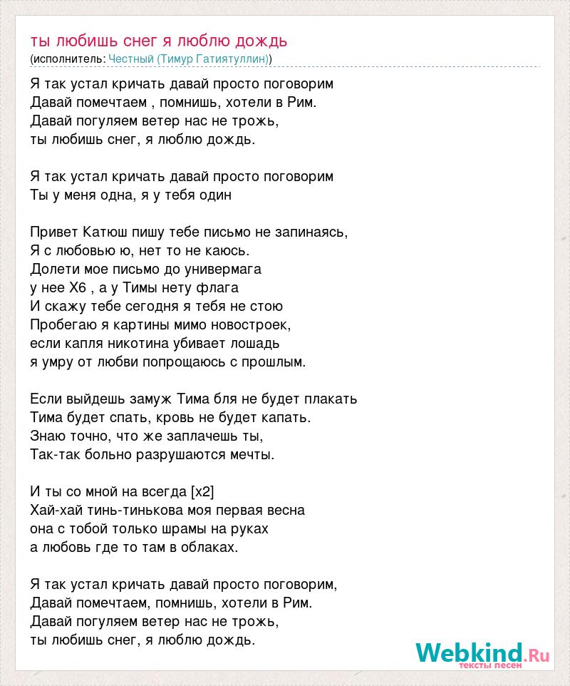 Я так устал кричать давай просто поговорим Давай помечтаем , помнишь, хотели в Рим. Давай погуляем ветер нас не трожь, ты любишь снег, я люблю дождь. Я так устал кричать давай просто поговорим Ты у меня одна, я у тебя один Привет Катюш пишу тебе письмо не запинаясь, Я с любовью ю, нет то не каюсь. Долети мое письмо до универмага у нее X6 , а у Тимы нету флага И скажу тебе сегодня я тебя не стою Пробегаю я картины мимо новостроек, если капля никотина убивает лошадь я умру от любви попрощаюсь с прошлым. Если выйдешь замуж Тима бля не будет плакать Тима будет спать, кровь не будет капать. Знаю точно, что же заплачешь ты, Так-так больно разрушаются мечты. И ты со мной на всегда [x2] Хай-хай тинь-тинькова моя первая весна она с тобой только шрамы на руках а любовь где то там в облаках. Я так устал кричать давай просто поговорим, Давай помечтаем, помнишь, хотели в Рим. Давай погуляем ветер нас не трожь, ты любишь снег, я люблю дождь.
