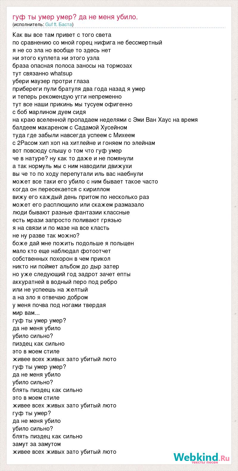 Как вы все там привет с того света по сравнению со мной горец нифига не бессмертный я не со зла но вообще то здесь нет ни этого куплета ни этого узла браза опасная полоса заносы на тормозах тут связанно whatsup убери маузер протри глаза прибереги пули братуля два года назад я умер и теперь рекомендую угги непременно тут все наши прикинь мы тусуем офигенно с боб марлином дуем сидя на краю вселенной пропадаем неделями с Эми Ван Хаус на время балдеем макареном с Садамой Хусейном туда где забыли навсегда успеем с Михеем с 2Pacом хип хоп на хитлейне и гоняем по элейнам вот повсюду слышу о том что гуф умер че в натуре? ну как то даже и не помянули а так нормуль мы с ним наводили движухи вы че то по ходу перепутали иль вас наебнули может все таки его убило с ним бывает такое часто когда он пересекается с кириллом вижу его каждый день притом по несколько раз может его расплющило или скажем размазало люди бывают разные фантазии классные есть мрази запросто поливают грязью я на связи и по мазе на все класть не ну разве так можно? боже дай мне пожить подольше я польщен мало кто еще наблюдал фотоотчет собственных похорон в чем прикол никто ни поймет альбом до дыр затер но уже следующий год задрот зачет епты аккуратней в водный перо под ребро или не успеешь на желтый а на зло я отвечаю добром у меня почва под ногами твердая мир вам... гуф ты умер умер? да не меня убило убило сильно? пиздец как сильно это в моем стиле живее всех живых зато убитый люто гуф ты умер умер? да не меня убило убило сильно? блять пиздец как сильно это в моем стиле живее всех живых зато убитый люто гуф ты умер? да не меня убило убило сильно? блять пиздец как сильно замут за замутом живее всех живых зато убитый люто