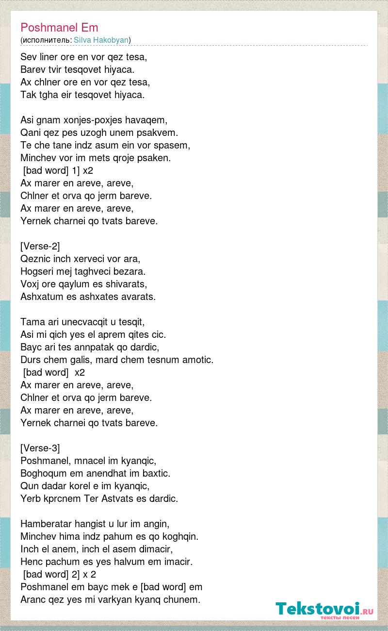 Sev liner ore en vor qez tesa, Barev tvir tesqovet hiyaca. Ax chlner ore en vor qez tesa, Tak tgha eir tesqovet hiyaca. Asi gnam xonjes-poxjes havaqem, Qani qez pes uzogh unem psakvem. Te che tane indz asum ein vor spasem, Minchev vor im mets qroje psaken. [Chorus-1] x2 Ax marer en areve, areve, Chlner et orva qo jerm bareve. Ax marer en areve, areve, Yernek charnei qo tvats bareve. [Verse-2] Qeznic inch xerveci vor ara, Hogseri mej taghveci bezara. Voxj ore qaylum es shivarats, Ashxatum es ashxates avarats. Tama ari unecvacqit u tesqit, Asi mi qich yes el aprem qites cic. Bayc ari tes annpatak qo dardic, Durs chem galis, mard chem tesnum amotic. [Chorus] x2 Ax marer en areve, areve, Chlner et orva qo jerm bareve. Ax marer en areve, areve, Yernek charnei qo tvats bareve. [Verse-3] Poshmanel, mnacel im kyanqic, Boghoqum em anendhat im baxtic. Qun dadar korel e im kyanqic, Yerb kprcnem Ter Astvats es dardic. Hamberatar hangist u lur im angin, Minchev hima indz pahum es qo koghqin. Inch el anem, inch el asem dimacir, Henc pachum es yes halvum em imacir. [Chorus-2] x 2 Poshmanel em bayc mek e sirum em Aranc qez yes mi varkyan kyanq chunem.