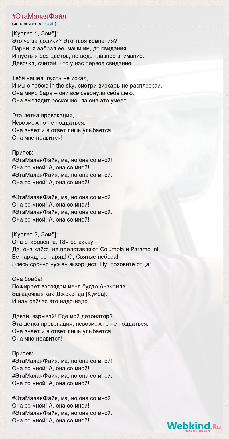 [Куплет 1, Зомб]: Это че за додики? Это твоя компания? Парни, я забрал ее, маши им, до свидания. И пусть я без цветов, но ведь главное внимание. Девочка, считай, что у нас первое свидание. Тебя нашел, пусть не искал, И мы с тобою in the sky, смотри вискарь не расплескай. Она мимо бара – они все свернули себе шею. Она выглядит роскошно, да она это умеет. Эта детка провокация, Невозможно не поддаться. Она знает и в ответ лишь улыбается. Она мне нравится! Припев: #ЭтаМалаяФайя, ма, но она со мной! Она со мной! А, она со мной! #ЭтаМалаяФайя, ма, но она со мной. Она со мной! А, она со мной! #ЭтаМалаяФайя, ма, но она со мной. Она со мной! А, она со мной! #ЭтаМалаяФайя, ма, но она со мной. Она со мной! А, она со мной! [Куплет 2, Зомб]: Она откровенна, 18+ ее аккаунт. Да, она кайф, не представляют Columbia и Paramount. Ее наряд, ее наряд! О, Святые небеса! Здесь срочно нужен экзорцист. Ну, позовите отца! Она бомба! Пожирает взглядом меня будто Анаконда. Загадочная как Джоконда [Кумба]. И нам сейчас это надо-надо. Давай, взрывай! Где мой детонатор? Эта детка провокация, невозможно не поддаться. Она знает и в ответ лишь улыбается. Она мне нравится! Припев: #ЭтаМалаяФайя, ма, но она со мной! Она со мной! А, она со мной! #ЭтаМалаяФайя, ма, но она со мной. Она со мной! А, она со мной! #ЭтаМалаяФайя, ма, но она со мной. Она со мной! А, она со мной! #ЭтаМалаяФайя, ма, но она со мной. Она со мной! А, она со мной!