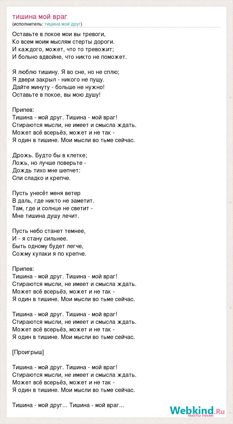 Оставьте в покое мои вы тревоги, Ко всем моим мыслям стерты дороги. И каждого, может, что то тревожит; И больно вдвойне, что никто не поможет. Я люблю тишину. Я во сне, но не сплю; Я двери закрыл - никого не пущу. Дайте минуту - больше не нужно! Оставьте в покое, вы мою душу! Припев: Тишина - мой друг. Тишина - мой враг! Стираются мысли, не имеет и смысла ждать. Может всё всерьёз, может и не так - Я один в тишине. Мои мысли во тьме сейчас. Дрожь. Будто бы в клетке; Ложь, но лучше поверьте - Дождь тихо мне шепчет: Спи сладко и крепче. Пусть унесёт меня ветер В даль, где никто не заметит. Там, где и солнце не светит - Мне тишина душу лечит. Пусть небо станет темнее, И - я стану сильнее. Быть одному будет легче, Сожму кулаки я по крепче. Припев: Тишина - мой друг. Тишина - мой враг! Стираются мысли, не имеет и смысла ждать. Может всё всерьёз, может и не так - Я один в тишине. Мои мысли во тьме сейчас. Тишина - мой друг. Тишина - мой враг! Стираются мысли, не имеет и смысла ждать. Может всё всерьёз, может и не так - Я один в тишине. Мои мысли во тьме сейчас. [Проигрыш] Тишина - мой друг. Тишина - мой враг! Стираются мысли, не имеет и смысла ждать. Может всё всерьёз, может и не так - Я один в тишине. Мои мысли во тьме сейчас. Тишина - мой друг... Тишина - мой враг...