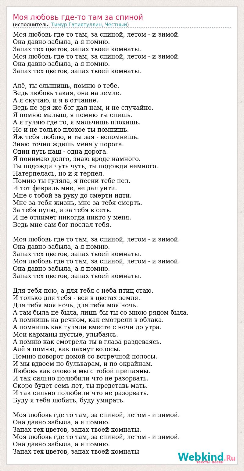Моя любовь где то там, за спиной, летом - и зимой. Она давно забыла, а я помню. Запах тех цветов, запах твоей комнаты. Моя любовь где то там, за спиной, летом - и зимой. Она давно забыла, а я помню. Запах тех цветов, запах твоей комнаты. Алё, ты слышишь, помню о тебе. Ведь любовь такая, она на земле. А я скучаю, и я в отчаине. Ведь не зря же бог дал нам, и не случайно. Я помню малыш, я помню ты спишь. А я гуляю где то, я мальчишь плохишь. Но и не только плохое ты помнишь. Яж тебя люблю, и ты зая - вспомнишь. Знаю точно ждешь меня у порога. Один путь наш - одна дорога. Я понимаю долго, знаю вроде намного. Ты подожди чуть чуть, ты подожди немного. Натерпелась, но и я терпел. Помню ты гуляла, я песни тебе пел. И тот февраль мне, не дал уйти. Мне с тобой за руку до смерти идти. Мне за тебя жизнь, мне за тебя смерть. За тебя пулю, и за тебя в сеть. И не отнимет никогда никто у меня. Ведь мне сам бог послал тебя. Моя любовь где то там, за спиной, летом - и зимой. Она давно забыла, а я помню. Запах тех цветов, запах твоей комнаты. Моя любовь где то там, за спиной, летом - и зимой. Она давно забыла, а я помню. Запах тех цветов, запах твоей комнаты. Для тебя пою, а для тебя с неба птиц стаю. И только для тебя - вся в цветах земля. Для тебя моя ночь, для тебя моя ночь. А там была не была, лишь бы ты со мною рядом была. А помнишь на речном, как смотрели в облака. А помнишь как гуляли вместе с ночи до утра. Мои карманы пустые, улыбаясь. А помню как смотрела ты в глаза раздеваясь. Алё я помню, как пахнут волосы. Помню поворот домой со встречной полосы. И мы вдвоем по бульварам, и по окрайнам. Любовь как олово и мы с тобой припаяны. И так сильно полюбили что не разорвать. Скоро будет семь лет, ты представь мать. И так сильно полюбили что не разорвать. Буду я тебя любить, буду умирать. Моя любовь где то там, за спиной, летом - и зимой. Она давно забыла, а я помню. Запах тех цветов, запах твоей комнаты. Моя любовь где то там, за спиной, летом - и зимой. Она давно забыла, а я помню. Запах тех цветов, запах твоей комнаты