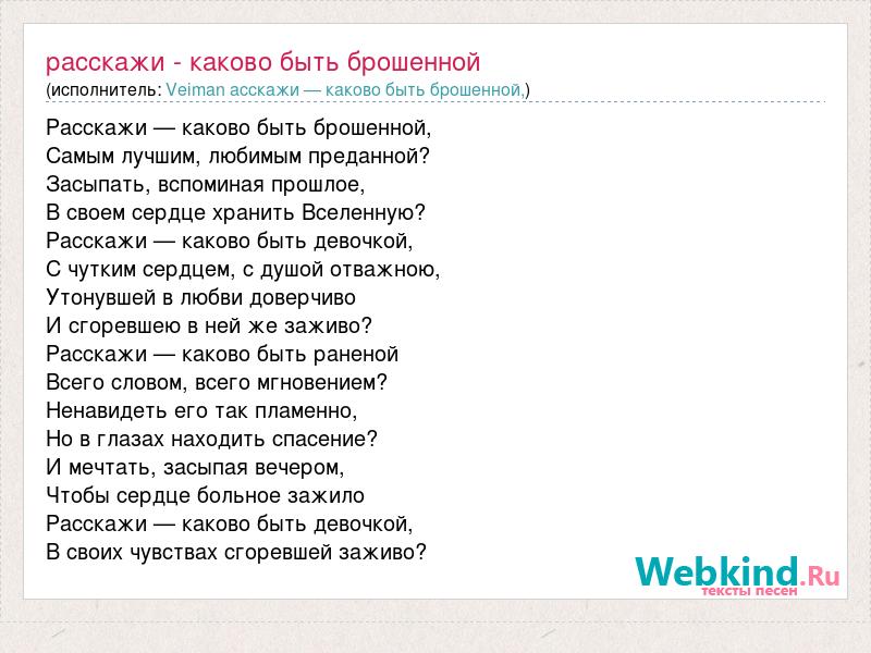 А как ты думаешь, о чем песня "Расскажи - каково быть брошенной" ?