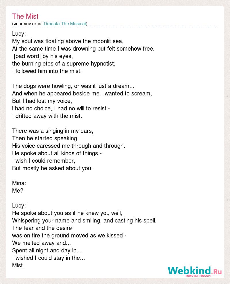 Lucy: My soul was floating above the moonlit sea, At the same time I was drowning but felt somehow free. [bad word] by his eyes, the burning etes of a supreme hypnotist, I followed him into the mist. The dogs were howling, or was it just a dream... And when he appeared beside me I wanted to scream, But I had lost my voice, i had no choice, I had no will to resist - I drifted away with the mist. There was a singing in my ears, Then he started speaking. His voice caressed me through and through. He spoke about all kinds of things - I wish I could remember, But mostly he asked about you. Mina: Me? Lucy: He spoke about you as if he knew you well, Whispering your name and smiling, and casting his spell. The fear and the desire was on fire the ground moved as we kissed - We melted away and... Spent all night and day in... I wished I could stay in the... Mist.