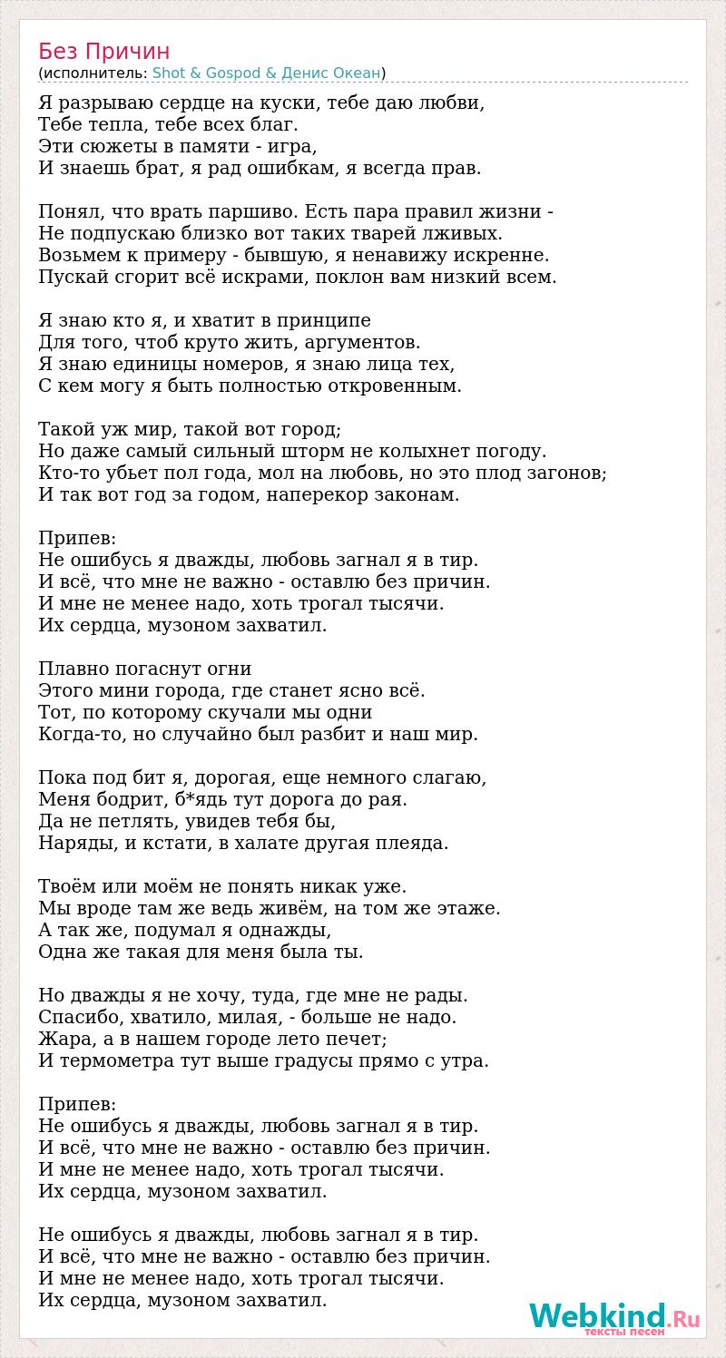 Я разрываю сердце на куски, тебе даю любви, Тебе тепла, тебе всех благ. Эти сюжеты в памяти - игра, И знаешь брат, я рад ошибкам, я всегда прав. Понял, что врать паршиво. Есть пара правил жизни - Не подпускаю близко вот таких тварей лживых. Возьмем к примеру - бывшую, я ненавижу искренне. Пускай сгорит всё искрами, поклон вам низкий всем. Я знаю кто я, и хватит в принципе Для того, чтоб круто жить, аргументов. Я знаю единицы номеров, я знаю лица тех, С кем могу я быть полностью откровенным. Такой уж мир, такой вот город; Но даже самый сильный шторм не колыхнет погоду. Кто-то убьет пол года, мол на любовь, но это плод загонов; И так вот год за годом, наперекор законам. Припев: Не ошибусь я дважды, любовь загнал я в тир. И всё, что мне не важно - оставлю без причин. И мне не менее надо, хоть трогал тысячи. Их сердца, музоном захватил. Плавно погаснут огни Этого мини города, где станет ясно всё. Тот, по которому скучали мы одни Когда-то, но случайно был разбит и наш мир. Пока под бит я, дорогая, еще немного слагаю, Меня бодрит, б*ядь тут дорога до рая. Да не петлять, увидев тебя бы, Наряды, и кстати, в халате другая плеяда. Твоём или моём не понять никак уже. Мы вроде там же ведь живём, на том же этаже. А так же, подумал я однажды, Одна же такая для меня была ты. Но дважды я не хочу, туда, где мне не рады. Спасибо, хватило, милая, - больше не надо. Жара, а в нашем городе лето печет; И термометра тут выше градусы прямо с утра. Припев: Не ошибусь я дважды, любовь загнал я в тир. И всё, что мне не важно - оставлю без причин. И мне не менее надо, хоть трогал тысячи. Их сердца, музоном захватил. Не ошибусь я дважды, любовь загнал я в тир. И всё, что мне не важно - оставлю без причин. И мне не менее надо, хоть трогал тысячи. Их сердца, музоном захватил.