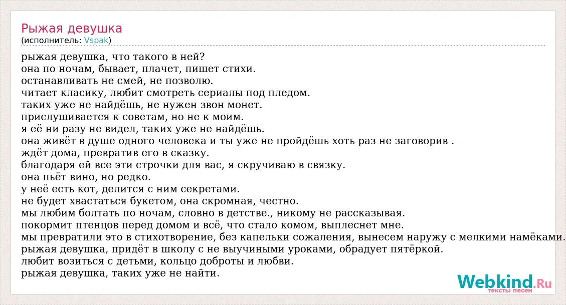 рыжая девушка, что такого в ней? она по ночам, бывает, плачет, пишет стихи. останавливать не смей, не позволю. читает класику, любит смотреть сериалы под пледом. таких уже не найдёшь, не нужен звон монет. прислушивается к советам, но не к моим. я её ни разу не видел, таких уже не найдёшь. она живёт в душе одного человека и ты уже не пройдёшь хоть раз не заговорив . ждёт дома, превратив его в сказку. благодаря ей все эти строчки для вас, я скручиваю в связку. она пьёт вино, но редко. у неё есть кот, делится с ним секретами. не будет хвастаться букетом, она скромная, честно. мы любим болтать по ночам, словно в детстве., никому не рассказывая. покормит птенцов перед домом и всё, что стало комом, выплеснет мне. мы превратили это в стихотворение, без капельки сожаления, вынесем наружу с мелкими намёками. рыжая девушка, придёт в школу с не выучиными уроками, обрадует пятёркой. любит возиться с детьми, кольцо доброты и любви. рыжая девушка, таких уже не найти.