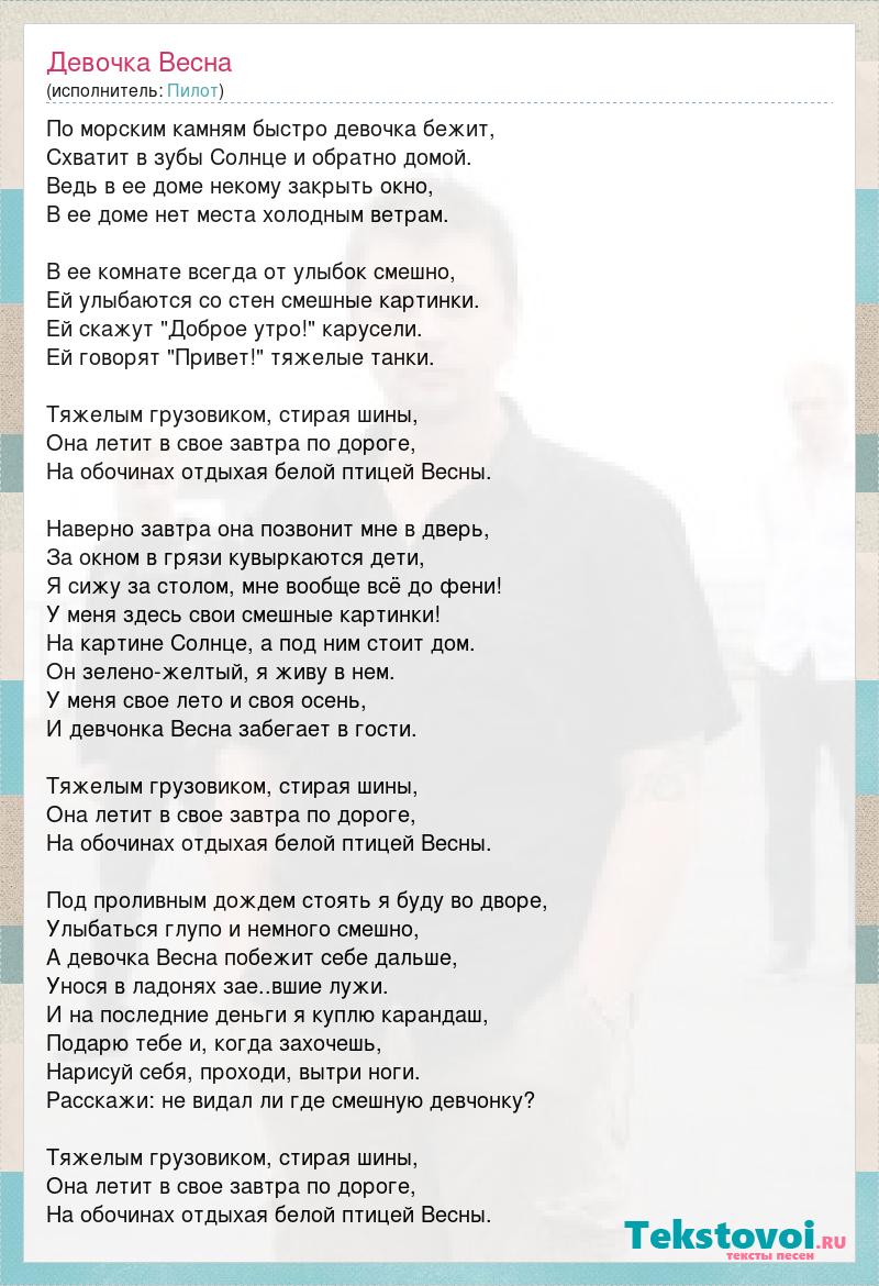 По морским камням быстро девочка бежит, Схватит в зубы Солнце и обратно домой. Ведь в ее доме некому закрыть окно, В ее доме нет места холодным ветрам. В ее комнате всегда от улыбок смешно, Ей улыбаются со стен смешные картинки. Ей скажут "Доброе утро!" карусели. Ей говорят "Привет!" тяжелые танки. Тяжелым грузовиком, стирая шины, Она летит в свое завтра по дороге, На обочинах отдыхая белой птицей Весны. Наверно завтра она позвонит мне в дверь, За окном в грязи кувыркаются дети, Я сижу за столом, мне вообще всё до фени! У меня здесь свои смешные картинки! На картине Солнце, а под ним стоит дом. Он зелено-желтый, я живу в нем. У меня свое лето и своя осень, И девчонка Весна забегает в гости. Тяжелым грузовиком, стирая шины, Она летит в свое завтра по дороге, На обочинах отдыхая белой птицей Весны. Под проливным дождем стоять я буду во дворе, Улыбаться глупо и немного смешно, А девочка Весна побежит себе дальше, Унося в ладонях зае..вшие лужи. И на последние деньги я куплю карандаш, Подарю тебе и, когда захочешь, Нарисуй себя, проходи, вытри ноги. Расскажи: не видал ли где смешную девчонку? Тяжелым грузовиком, стирая шины, Она летит в свое завтра по дороге, На обочинах отдыхая белой птицей Весны.