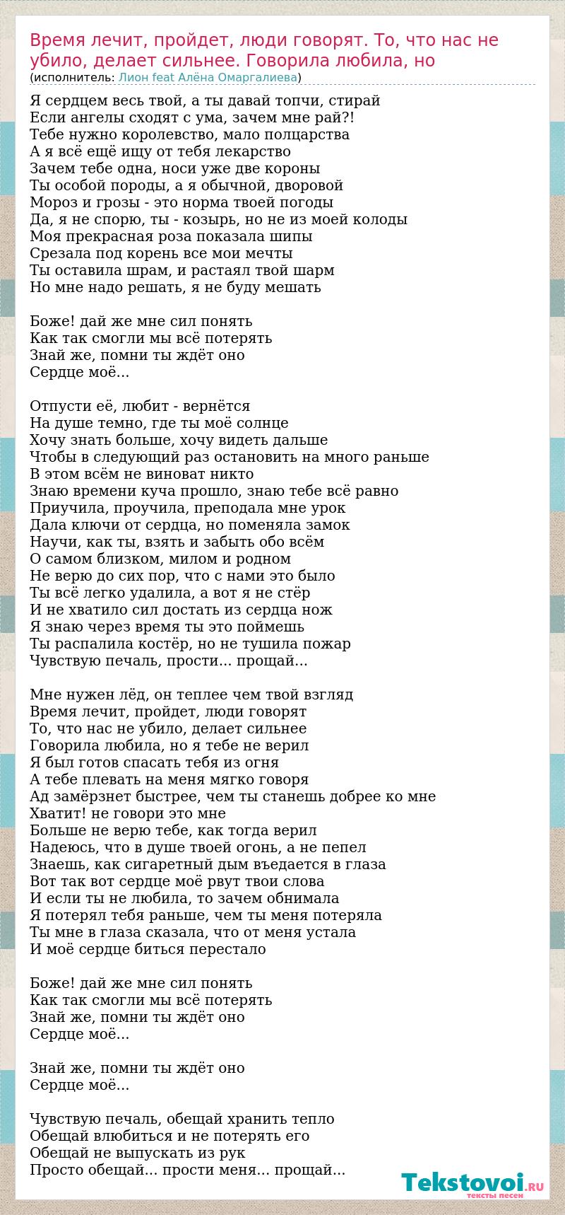 Главная→Исполнители→Лион feat Алёна Омаргалиева→Время лечит, пройдет, люди говорят. То, что нас не убило, делает сильнее. Го
