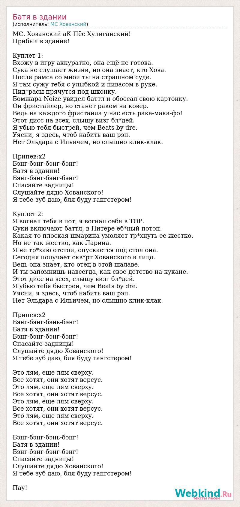 МС. Хованский аК Пёс Хулиганский! Прибыл в здание! Куплет 1: Вхожу в игру аккуратно, она ещё не готова. Сука не слушает жизни, но она знает, кто Хова. После рамса со мной ты на страшном суде. Я там сужу тебя с улыбкой и пивасом в руке. Пид*расы прячутся под шконку. Бомжара Noize увидел баттл и обоссал свою картонку. Он фристайлер, но станет раком на ковер. Ведь на каждого фристайла у нас есть рака-мака-фо! Этот дисс на всех, слышу визг бл*дей. Я убью тебя быстрей, чем Beats by dre. Уясни, я здесь, чтоб набить ваш рэп. Нет Эльдара с Ильичем, но слышно клик-клак. Припев:х2 Бэнг-бэнг-бэнг-бэнг! Батя в здании! Бэнг-бэнг-бэнг-бэнг! Спасайте задницы! Слушайте дядю Хованского! Я тебе зуб даю, бля буду гангстером! Куплет 2: Я вогнал тебя в пот, я вогнал себя в TOP. Суки включают баттл, в Питере еб*ный потоп. Какая то плоская шмарина умоляет тр*хнуть ее жестко. Но не так жестко, как Ларина. Я не тр*хаю отстой, опускается под стол она. Сегодня получает скв*рт Хованского в лицо. Ведь она знает, кто отец в этой шалаве. И ты запомнишь навсегда, как свое детство на кукане. Этот дисс на всех, слышу визг бл*дей. Я убью тебя быстрей, чем Beats by dre. Уясни, я здесь, чтоб набить ваш рэп. Нет Эльдара с Ильичем, но слышно клик-клак. Припев:х2 Бэнг-бэнг-бэнь-бэнг! Батя в здании! Бэнг-бэнг-бэнг-бэнг! Спасайте задницы! Слушайте дядю Хованского! Я тебе зуб даю, бля буду гангстером! Это лям, еще лям сверху. Все хотят, они хотят версус. Это лям, еще лям сверху. Все хотят, они хотят версус. Это лям, еще лям сверху. Все хотят, они хотят версус. Это лям, еще лям сверху. Все хотят, они хотят версус. Бэнг-бэнг-бэнь-бэнг! Батя в здании! Бэнг-бэнг-бэнг-бэнг! Спасайте задницы! Слушайте дядю Хованского! Я тебе зуб даю, бля буду гангстером! Пау!