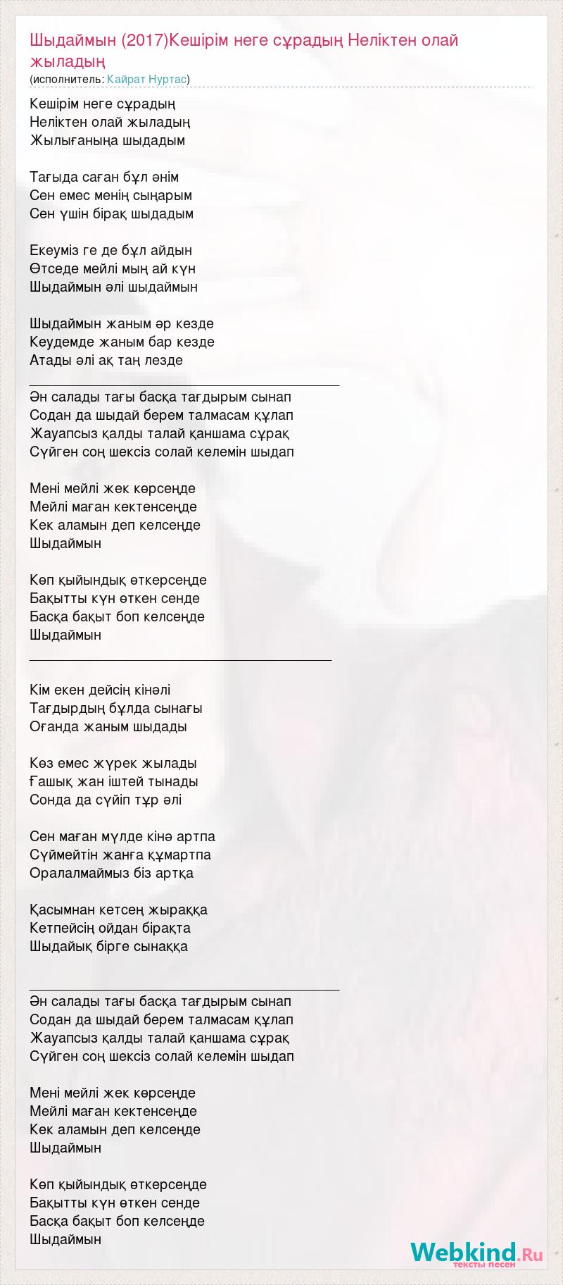 Кешірім неге сұрадың Неліктен олай жыладың Жылығаныңа шыдадым Тағыда саған бұл әнім Сен емес менің сыңарым Сен үшін бірақ шыдадым Екеуміз ге де бұл айдын Өтседе мейлі мың ай күн Шыдаймын әлі шыдаймын Шыдаймын жаным әр кезде Кеудемде жаным бар кезде Атады әлі ақ таң лезде ________________________________________ Ән салады тағы басқа тағдырым сынап Содан да шыдай берем талмасам құлап Жауапсыз қалды талай қаншама сұрақ Сүйген соң шексіз солай келемін шыдап Мені мейлі жек көрсеңде Мейлі маған кектенсеңде Кек аламын деп келсеңде Шыдаймын Көп қыйындық өткерсеңде Бақытты күн өткен сенде Басқа бақыт боп келсеңде Шыдаймын _______________________________________ Кім екен дейсің кінәлі Тағдырдың бұлда сынағы Оғанда жаным шыдады Көз емес жүрек жылады Ғашық жан іштей тынады Сонда да сүйіп тұр әлі Сен маған мүлде кінә артпа Сүймейтін жанға құмартпа Оралалмаймыз біз артқа Қасымнан кетсең жыраққа Кетпейсің ойдан бірақта Шыдайық бірге сынаққа ________________________________________ Ән салады тағы басқа тағдырым сынап Содан да шыдай берем талмасам құлап Жауапсыз қалды талай қаншама сұрақ Сүйген соң шексіз солай келемін шыдап Мені мейлі жек көрсеңде Мейлі маған кектенсеңде Кек аламын деп келсеңде Шыдаймын Көп қыйындық өткерсеңде Бақытты күн өткен сенде Басқа бақыт боп келсеңде Шыдаймын