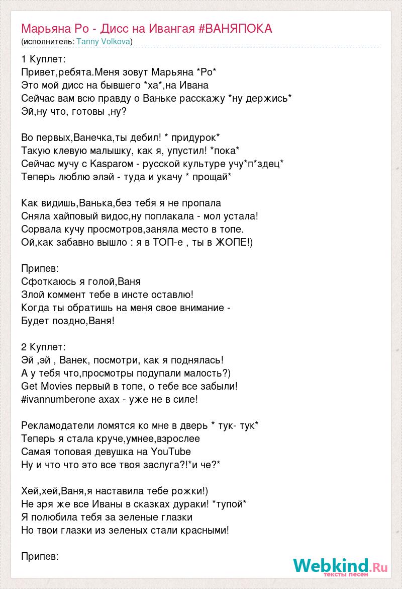 Привет,ребята.Меня зовут Марьяна *Ро* Это мой дисс на бывшего *ха*,на Ивана Сейчас вам всю правду о Ваньке расскажу *ну держись* Эй,ну что, готовы ,ну? Во первых,Ванечка,ты дебил! * придурок* Такую клевую малышку, как я, упустил! *пока* Сейчас мучу с Kasparом - русской культуре учу*п*здец* Теперь люблю элэй - туда и укачу * прощай* Как видишь,Ванька,без тебя я не пропала Сняла хайповый видос,ну поплакала - мол устала! Сорвала кучу просмотров,заняла место в топе. Ой,как забавно вышло : я в ТОП-е , ты в ЖОПЕ!) Припев: Сфоткаюсь я голой,Ваня Злой коммент тебе в инсте оставлю! Когда ты обратишь на меня свое внимание - Будет поздно,Ваня! 2 Куплет: Эй ,эй , Ванек, посмотри, как я поднялась! А у тебя что,просмотры подупали малость?) Get Movies первый в топе, о тебе все забыли! #ivannumberone ахах - уже не в силе! Рекламодатели ломятся ко мне в дверь * тук- тук* Теперь я стала круче,умнее,взрослее Самая топовая девушка на YouTube Ну и что что это все твоя заслуга?!*и че?* Хей,хей,Ваня,я наставила тебе рожки!) Не зря же все Иваны в сказках дураки! *тупой* Я полюбила тебя за зеленые глазки Но твои глазки из зеленых стали красными! Припев: