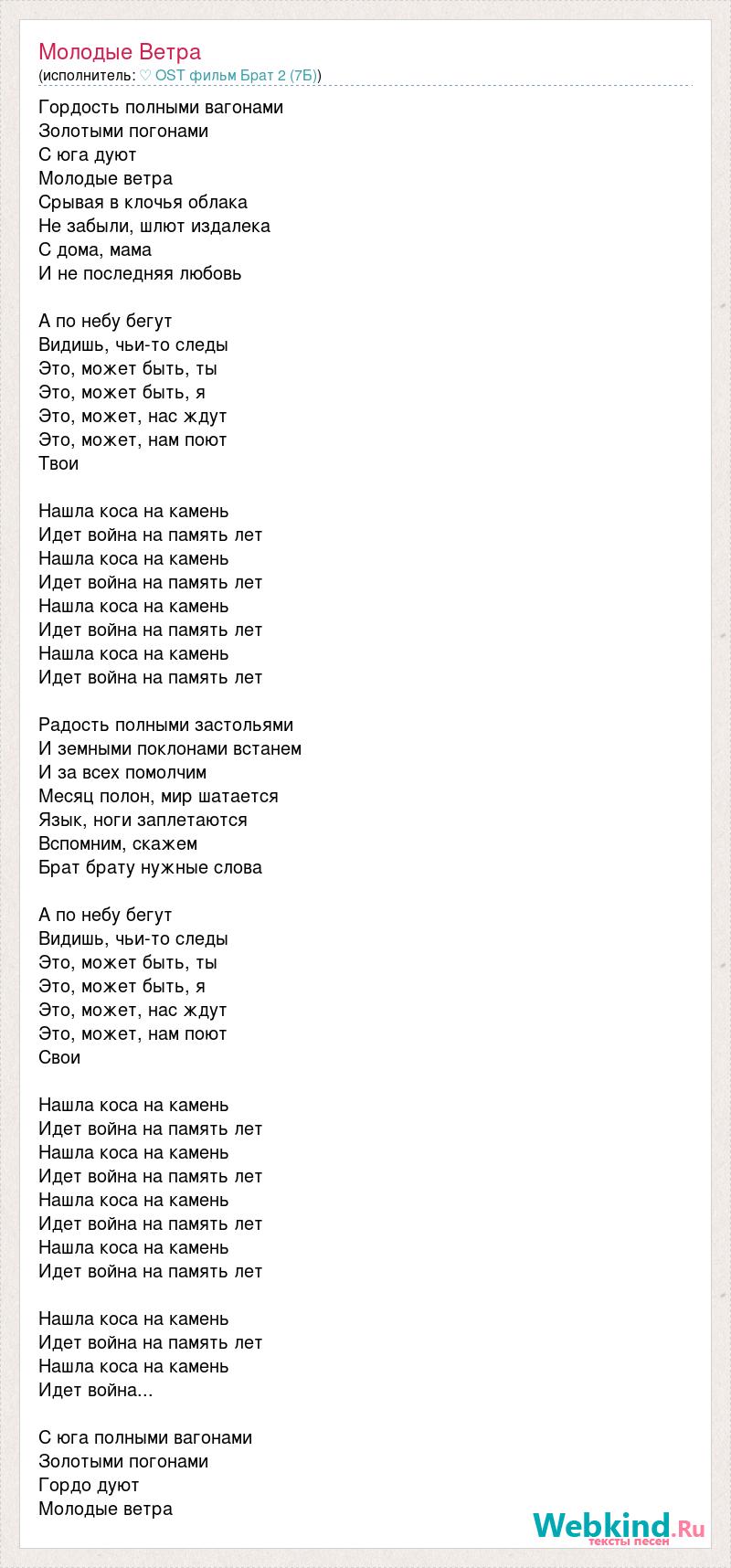 Гордость полными вагонами Золотыми погонами С юга дуют Молодые ветра Срывая в клочья облака Не забыли, шлют издалека С дома, мама И не последняя любовь А по небу бегут Видишь, чьи-то следы Это, может быть, ты Это, может быть, я Это, может, нас ждут Это, может, нам поют Твои Нашла коса на камень Идет война на память лет Нашла коса на камень Идет война на память лет Нашла коса на камень Идет война на память лет Нашла коса на камень Идет война на память лет Радость полными застольями И земными поклонами встанем И за всех помолчим Месяц полон, мир шатается Язык, ноги заплетаются Вспомним, скажем Брат брату нужные слова А по небу бегут Видишь, чьи-то следы Это, может быть, ты Это, может быть, я Это, может, нас ждут Это, может, нам поют Свои Нашла коса на камень Идет война на память лет Нашла коса на камень Идет война на память лет Нашла коса на камень Идет война на память лет Нашла коса на камень Идет война на память лет Нашла коса на камень Идет война на память лет Нашла коса на камень Идет война... С юга полными вагонами Золотыми погонами Гордо дуют Молодые ветра