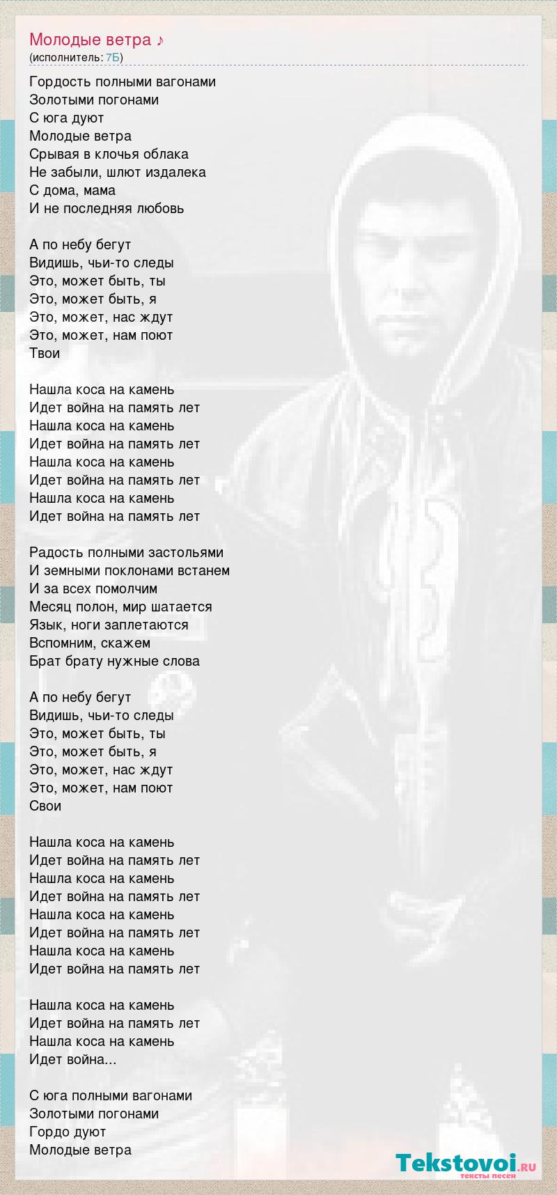 Гордость полными вагонами Золотыми погонами С юга дуют Молодые ветра Срывая в клочья облака Не забыли, шлют издалека С дома, мама И не последняя любовь А по небу бегут Видишь, чьи-то следы Это, может быть, ты Это, может быть, я Это, может, нас ждут Это, может, нам поют Твои Нашла коса на камень Идет война на память лет Нашла коса на камень Идет война на память лет Нашла коса на камень Идет война на память лет Нашла коса на камень Идет война на память лет Радость полными застольями И земными поклонами встанем И за всех помолчим Месяц полон, мир шатается Язык, ноги заплетаются Вспомним, скажем Брат брату нужные слова А по небу бегут Видишь, чьи-то следы Это, может быть, ты Это, может быть, я Это, может, нас ждут Это, может, нам поют Свои Нашла коса на камень Идет война на память лет Нашла коса на камень Идет война на память лет Нашла коса на камень Идет война на память лет Нашла коса на камень Идет война на память лет Нашла коса на камень Идет война на память лет Нашла коса на камень Идет война... С юга полными вагонами Золотыми погонами Гордо дуют Молодые ветра