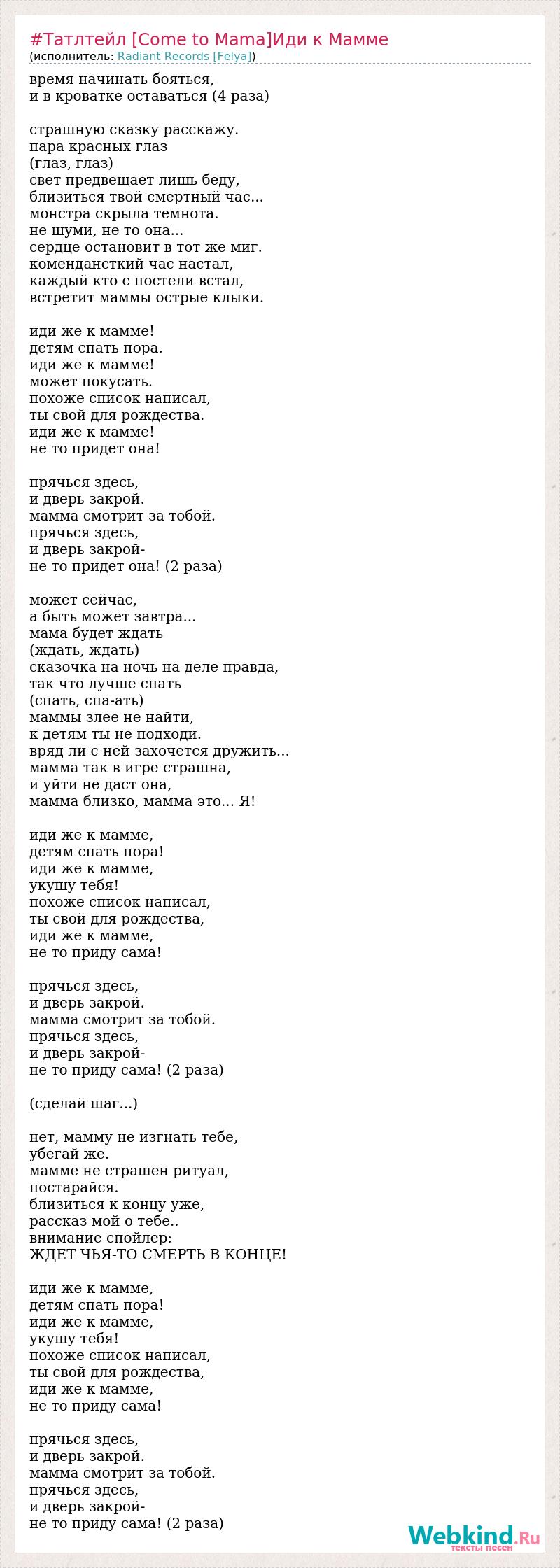 время начинать бояться, и в кроватке оставаться (4 раза) страшную сказку расскажу. пара красных глаз (глаз, глаз) свет предвещает лишь беду, близиться твой смертный час... монстра скрыла темнота. не шуми, не то она... сердце остановит в тот же миг. комендансткий час настал, каждый кто с постели встал, встретит маммы острые клыки. иди же к мамме! детям спать пора. иди же к мамме! может покусать. похоже список написал, ты свой для рождества. иди же к мамме! не то придет она! прячься здесь, и дверь закрой. мамма смотрит за тобой. прячься здесь, и дверь закрой- не то придет она! (2 раза) может сейчас, а быть может завтра... мама будет ждать (ждать, ждать) сказочка на ночь на деле правда, так что лучше спать (спать, спа-ать) маммы злее не найти, к детям ты не подходи. вряд ли с ней захочется дружить... мамма так в игре страшна, и уйти не даст она, мамма близко, мамма это... Я! иди же к мамме, детям спать пора! иди же к мамме, укушу тебя! похоже список написал, ты свой для рождества, иди же к мамме, не то приду сама! прячься здесь, и дверь закрой. мамма смотрит за тобой. прячься здесь, и дверь закрой- не то приду сама! (2 раза) (сделай шаг...) нет, мамму не изгнать тебе, убегай же. мамме не страшен ритуал, постарайся. близиться к концу уже, рассказ мой о тебе.. внимание спойлер: ЖДЕТ ЧЬЯ-ТО СМЕРТЬ В КОНЦЕ! иди же к мамме, детям спать пора! иди же к мамме, укушу тебя! похоже список написал, ты свой для рождества, иди же к мамме, не то приду сама! прячься здесь, и дверь закрой. мамма смотрит за тобой. прячься здесь, и дверь закрой- не то приду сама! (2 раза)