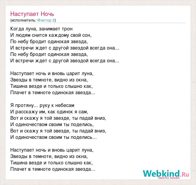 Когда луна, занимает трон И людям снится каждому свой сон, По небу бродит одинокая звезда, И встречи ждет с другой звездой всегда она... По небу бродит одинокая звезда, И встречи ждет с другой звездой всегда она... Наступает ночь и вновь царит луна, Звезды в темноте, видно из окна, Тишина везде и только слышно как, Плачет в темноте одинокая звезда... Я протяну... руку к небесам И расскажу им, как одинок я сам, Вот и скажу я той звезде, ты падай вниз, И одиночеством своим ты поделись, Вот и скажу я той звезде, ты падай вниз, И одиночеством своим ты поделись... Наступает ночь и вновь царит луна, Звезды в темноте, видно из окна, Тишина везде и только слышно как, Плачет в темноте одинокая звезда...