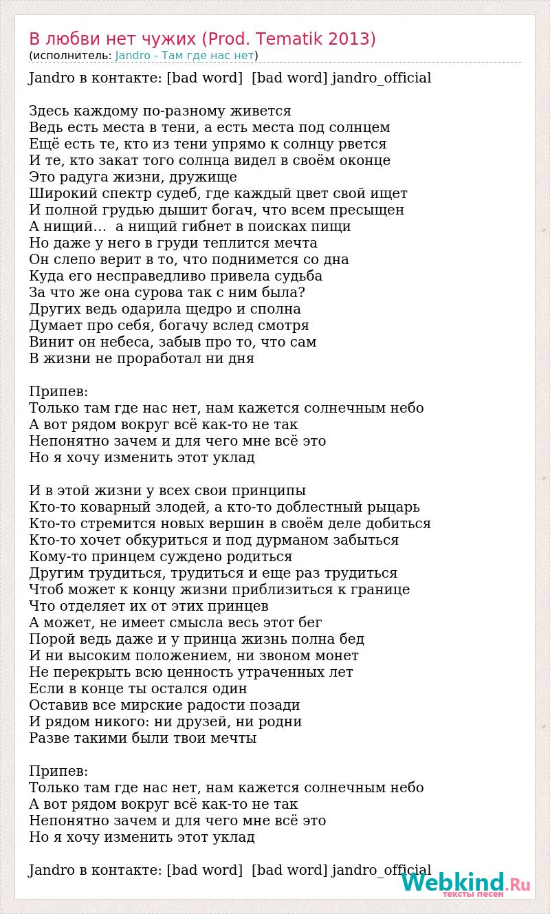 Jandro в контакте: [bad word] [bad word] jandro_official Здесь каждому по-разному живется Ведь есть места в тени, а есть места под солнцем Ещё есть те, кто из тени упрямо к солнцу рвется И те, кто закат того солнца видел в своём оконце Это радуга жизни, дружище Широкий спектр судеб, где каждый цвет свой ищет И полной грудью дышит богач, что всем пресыщен А нищий… а нищий гибнет в поисках пищи Но даже у него в груди теплится мечта Он слепо верит в то, что поднимется со дна Куда его несправедливо привела судьба За что же она сурова так с ним была? Других ведь одарила щедро и сполна Думает про себя, богачу вслед смотря Винит он небеса, забыв про то, что сам В жизни не проработал ни дня Припев: Только там где нас нет, нам кажется солнечным небо А вот рядом вокруг всё как-то не так Непонятно зачем и для чего мне всё это Но я хочу изменить этот уклад И в этой жизни у всех свои принципы Кто-то коварный злодей, а кто-то доблестный рыцарь Кто-то стремится новых вершин в своём деле добиться Кто-то хочет обкуриться и под дурманом забыться Кому-то принцем суждено родиться Другим трудиться, трудиться и еще раз трудиться Чтоб может к концу жизни приблизиться к границе Что отделяет их от этих принцев А может, не имеет смысла весь этот бег Порой ведь даже и у принца жизнь полна бед И ни высоким положением, ни звоном монет Не перекрыть всю ценность утраченных лет Если в конце ты остался один Оставив все мирские радости позади И рядом никого: ни друзей, ни родни Разве такими были твои мечты Припев: Только там где нас нет, нам кажется солнечным небо А вот рядом вокруг всё как-то не так Непонятно зачем и для чего мне всё это Но я хочу изменить этот уклад Jandro в контакте: [bad word] [bad word] jandro_official