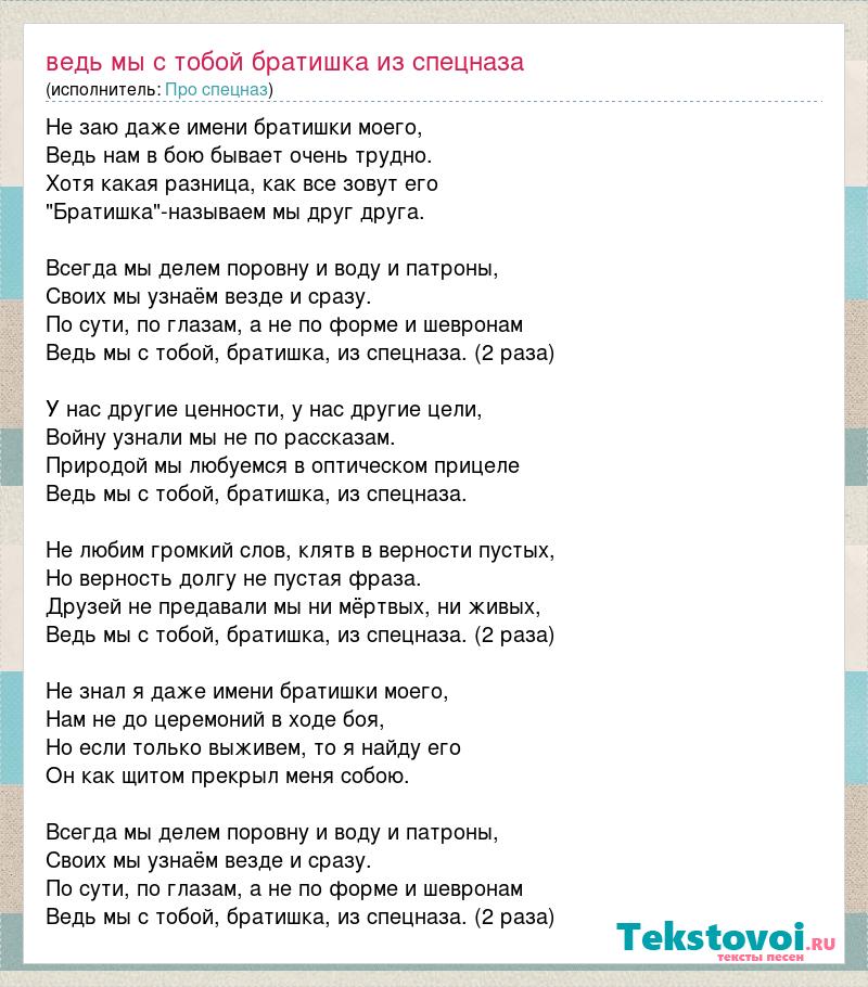 Не заю даже имени братишки моего, Ведь нам в бою бывает очень трудно. Хотя какая разница, как все зовут его "Братишка"-называем мы друг друга. Всегда мы делем поровну и воду и патроны, Своих мы узнаём везде и сразу. По сути, по глазам, а не по форме и шевронам Ведь мы с тобой, братишка, из спецназа. (2 раза) У нас другие ценности, у нас другие цели, Войну узнали мы не по рассказам. Природой мы любуемся в оптическом прицеле Ведь мы с тобой, братишка, из спецназа. Не любим громкий слов, клятв в верности пустых, Но верность долгу не пустая фраза. Друзей не предавали мы ни мёртвых, ни живых, Ведь мы с тобой, братишка, из спецназа. (2 раза) Не знал я даже имени братишки моего, Нам не до церемоний в ходе боя, Но если только выживем, то я найду его Он как щитом прекрыл меня собою. Всегда мы делем поровну и воду и патроны, Своих мы узнаём везде и сразу. По сути, по глазам, а не по форме и шевронам Ведь мы с тобой, братишка, из спецназа. (2 раза)