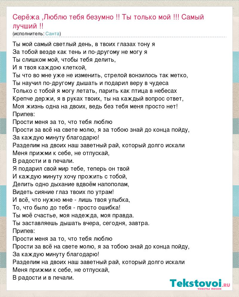 Ты мой самый светлый день, в твоих глазах тону я За тобой везде как тень и по-другому не могу я Ты слишком мой, чтобы тебя делить, И я твоя каждою клеткой, Ты что во мне уже не изменить, стрелой вонзилось так метко, Ты научил по-другому дышать и подарил веру в чудеса Только с тобой я могу летать, парить как птица в небесах Крепче держи, я в руках твоих, ты на каждый вопрос ответ, Моя жизнь одна на двоих, ведь без тебя меня просто нет! Припев: Прости меня за то, что тебя люблю Прости за всё на свете молю, я за тобою знай до конца пойду, За каждую минуту благодарю! Разделим на двоих наш заветный рай, который долго искали Меня прижми к себе, не отпускай, В радости и в печали. Я подарил свой мир тебе, теперь он твой И каждую минуту хочу прожить с тобой, Делить одно дыхание вдвоём напополам, Видеть сияние глаз твоих по утрам! И всё, что нужно мне - лишь твоя улыбка, То, что было до тебя - просто ошибка! Ты моё счастье, моя надежда, моя правда. Ты заставляешь дышать вчера, сегодня, завтра. Припев: Прости меня за то, что тебя люблю Прости за всё на свете молю, я за тобою знай до конца пойду, За каждую минуту благодарю! Разделим на двоих наш заветный рай, который долго искали Меня прижми к себе, не отпускай, В радости и в печали.